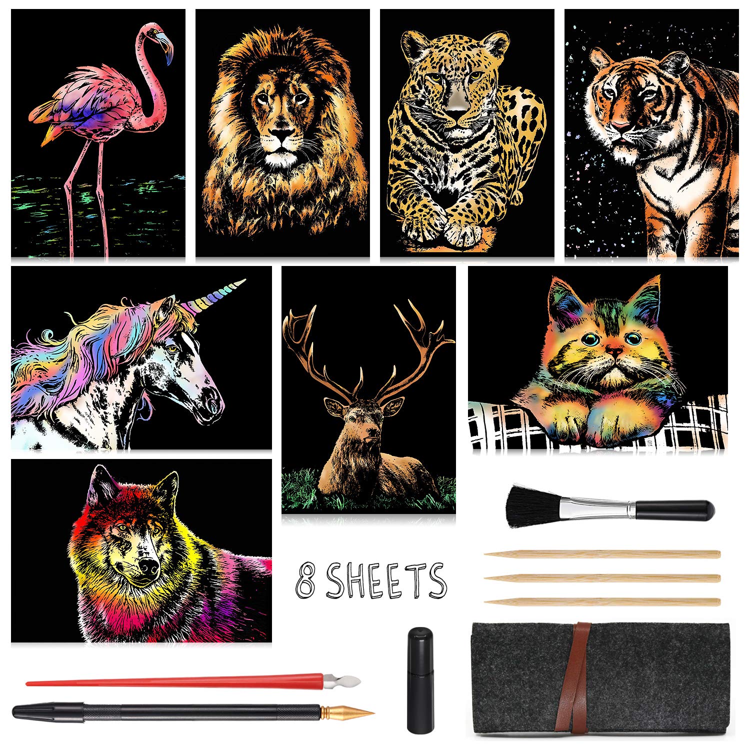 Scratch Art Paper(A4) for Kids & Adults, Rainbow Painting Night View Scratchboard, Art Craft, Crafts Set: 8 Sheets Scratch - Unicorn/Flamingo/Cat/Deer/Tiger/Leopard/Lion/Wolf & 6 Tools (Animal World)