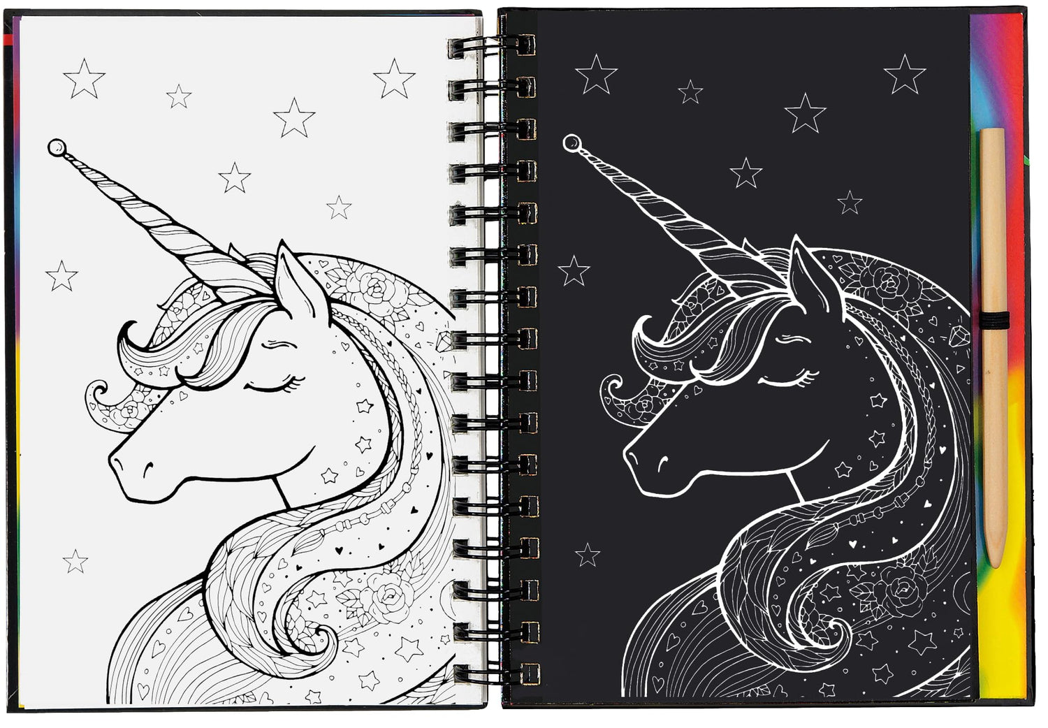 As you trace intricate artwork on the black-coated pages, a wolf, mandala, night sky, unicorn, and so much more emerge in sparkling foils of silver and green, or colorful swirls! Scratch away the black coating on each page with the stylus included, and see your puzzle solutions come to light in glittery sparkles and colorful swirls! Scratch book contains 10 black-coated silver or green glitter pages and 10 black-coated colorful swirl pages 20 intricate images to color. This is a Trace-Along title! Young artists can simply follow the white lines with the wooden stylus to create colorful pictures. Includes 20 extra paper pages for your own doodles and drawings. Book comes with a wooden stylus for scratching away the black coating. Art activity book measures 6-3/8'' wide x 8-1/2'' high. Ages 8 and up.