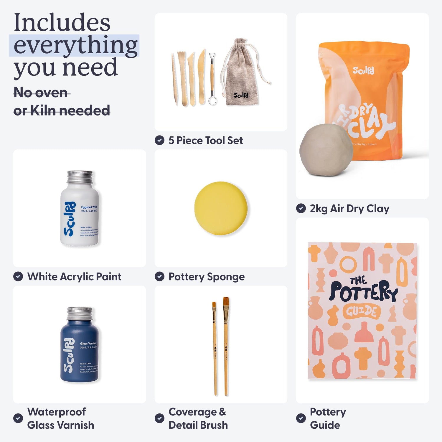 Sculpd - The Original Pottery Starter Kit - Complete Air Dry Clay Beginner Set for 2 Adults: Includes Sculpting Tools, Gloss Varnish, Paint Brushes, Guide, Video Tutorials & More - Gift, Arts Crafts
