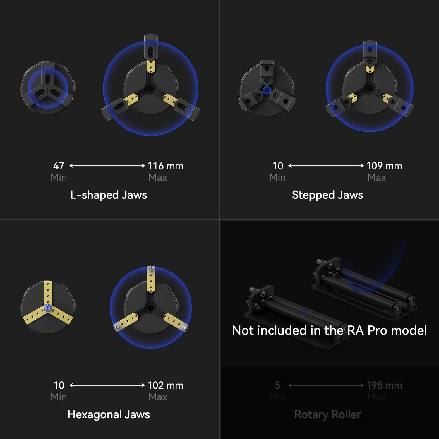 - 【3 in 1 Multi-function Chuck Rotary】The SCULPFUN RA Pro rotary chuck is equipped with 3 sets of jaw attachments: stepped jaws, L-shaped jaws and hexagonal jaws. By simply replacing the attachments, it enables the engraving of more objects with irregular shapes such as wine glasses, baseballs, baseball bats, glass cups, and handled mugs. This significantly expands your creative possibilities and meets the needs of engraving more heteromorphic object.(Rotary roller not included)