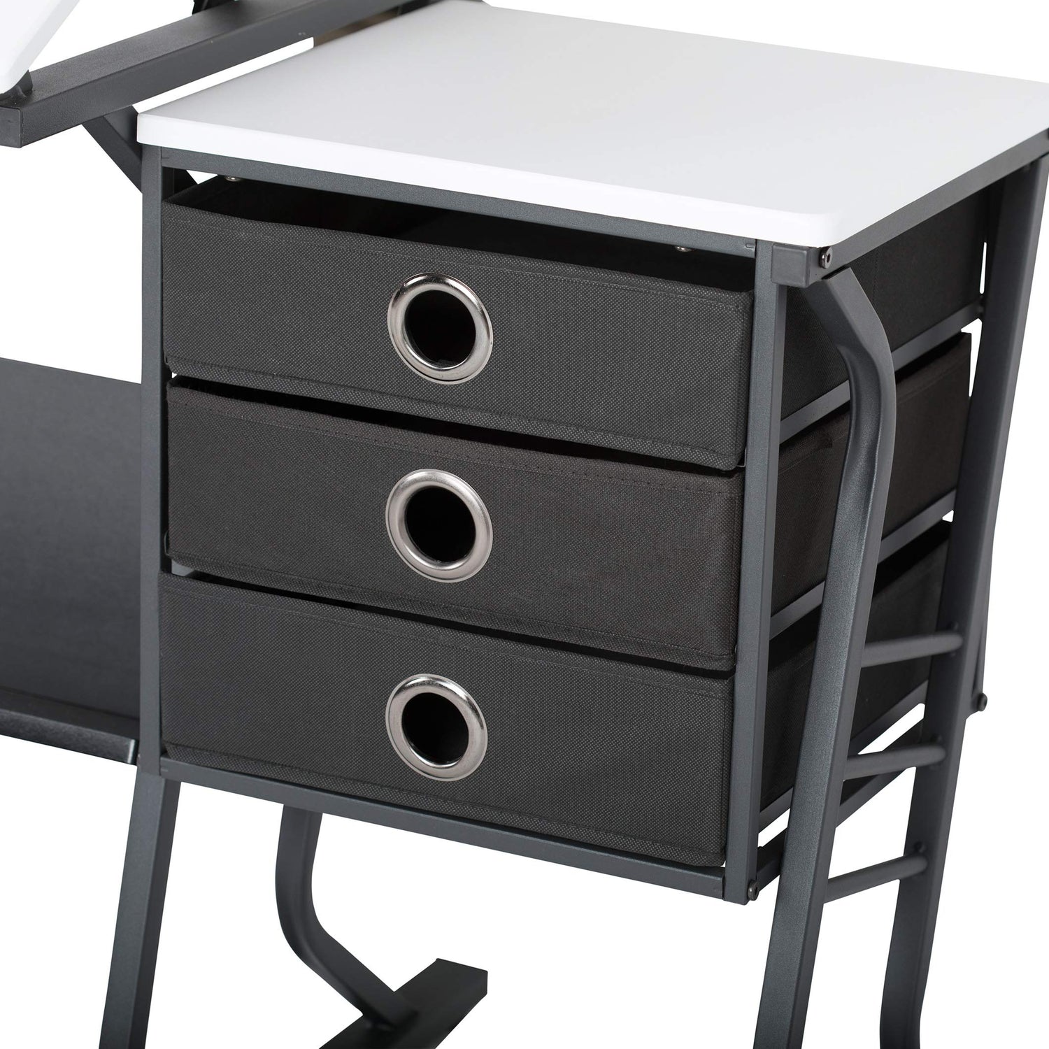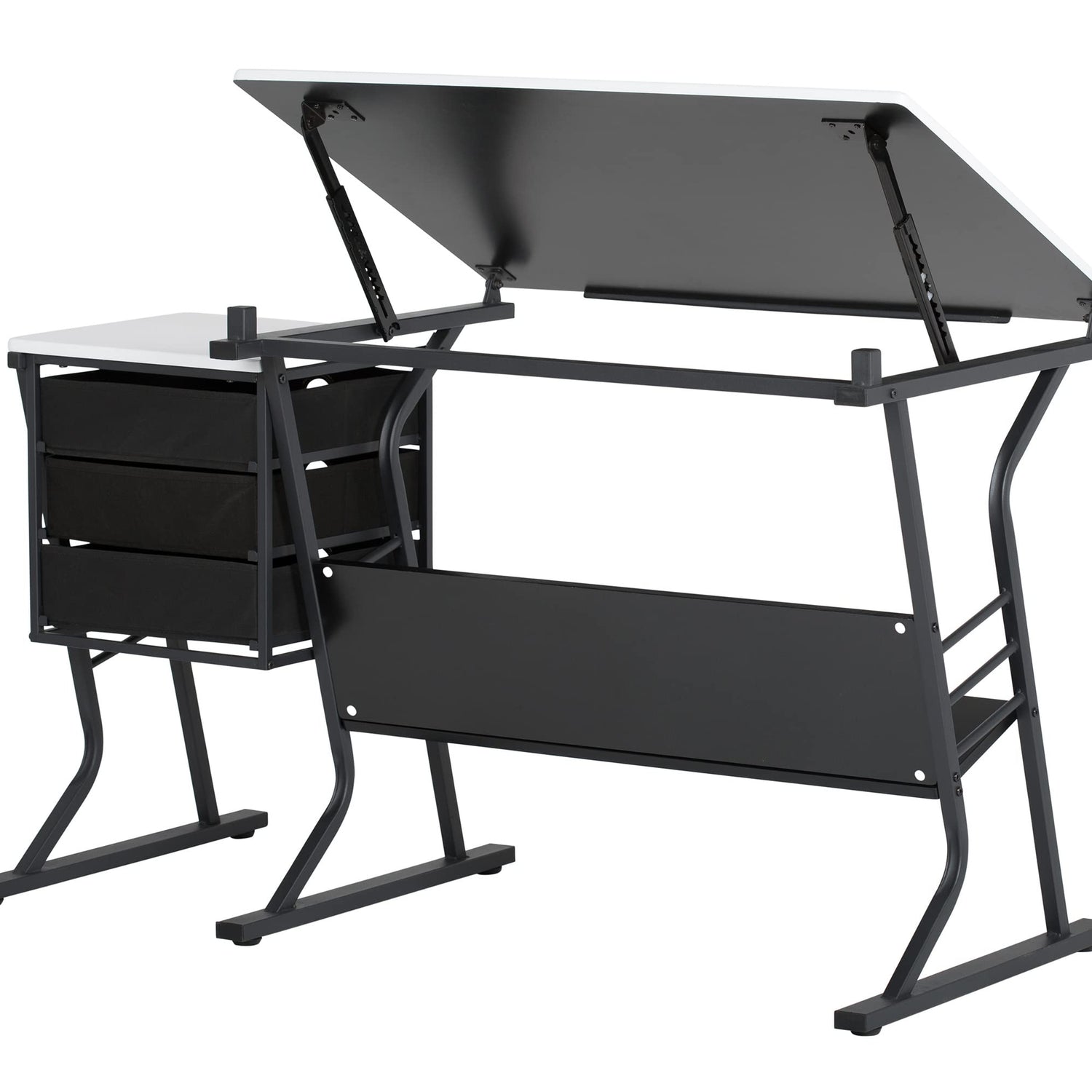 - STORAGE: Three 12.75" W x 12.75" D fabric drawers can be used to hold and organize papers and lighter tools. The side table top above the drawers offers a flat surface for a laptop or phone while the top is titled. The 32" wide metal storage shelf beneath the table top stores larger, heavier supplies.