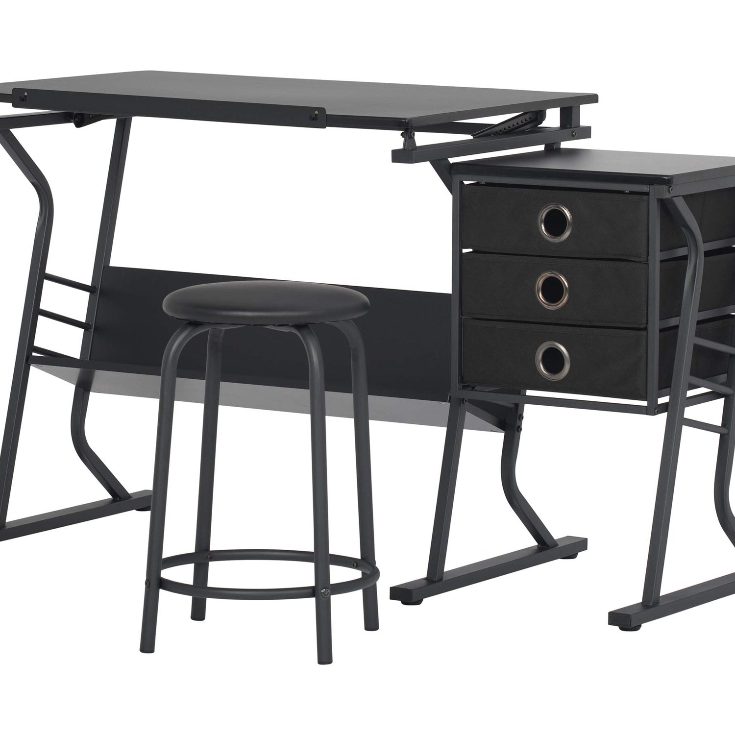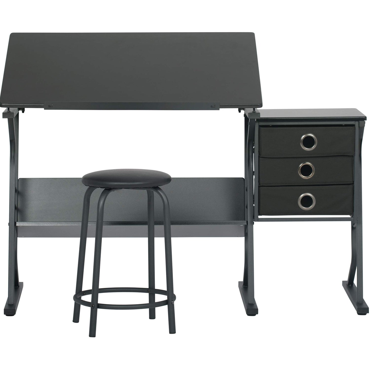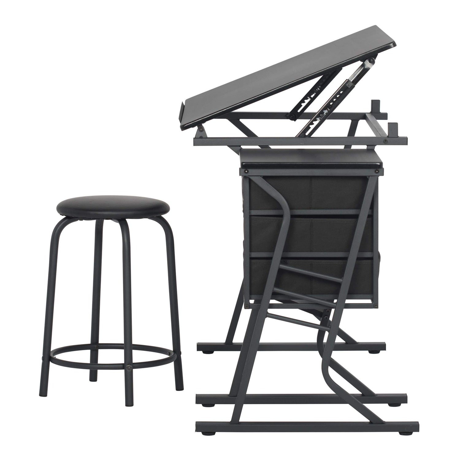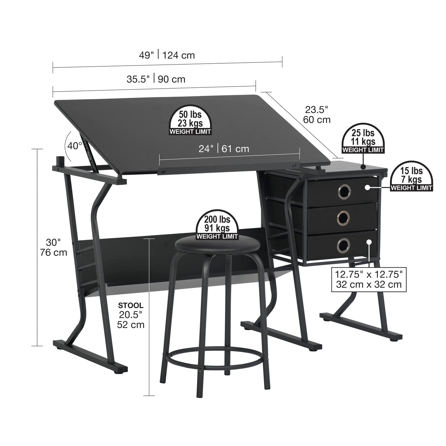 - The Eclipse Ultra Drafting Center by Studio Designs provides a comfortable work space and keeps your supplies easily accessible. The artist table top is adjustable up to 40 degrees and Includes a 24’’pencil ledge that slides up and locks into place when needed. The table and stool set also features three adjacent storage drawers. The durable heavy gauge steel construction Includes six floor levelers for stability. Overall dimension: 49 in. W x 24 in.D x 30 in. H