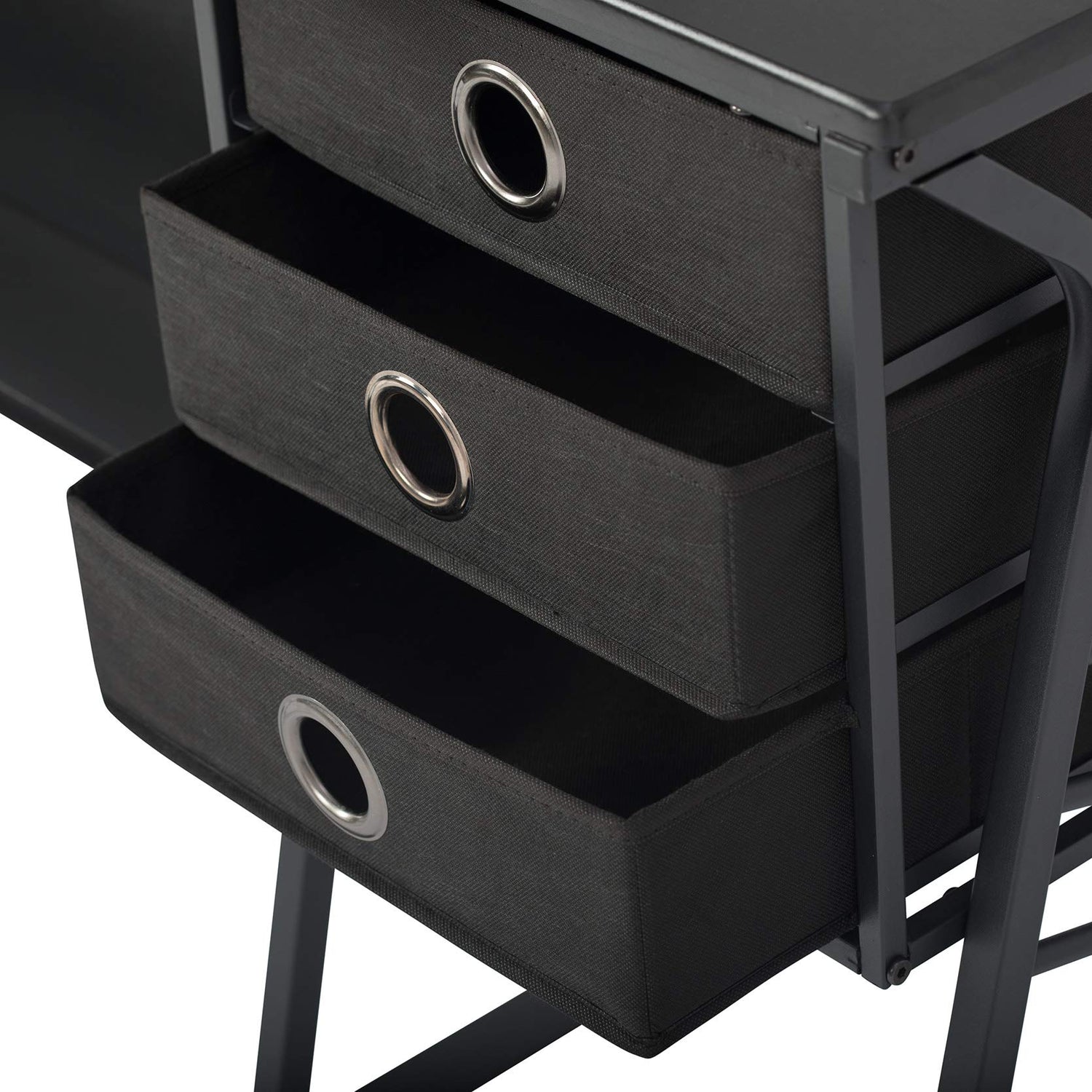 - STORAGE: Three 12.75" W x 12.75" D fabric drawers can be used to hold and organize papers and lighter tools. The side table top above the drawers offers a flat surface for a laptop or phone while the top is titled. The 32" wide metal storage shelf beneath the table top stores larger, heavier supplies.