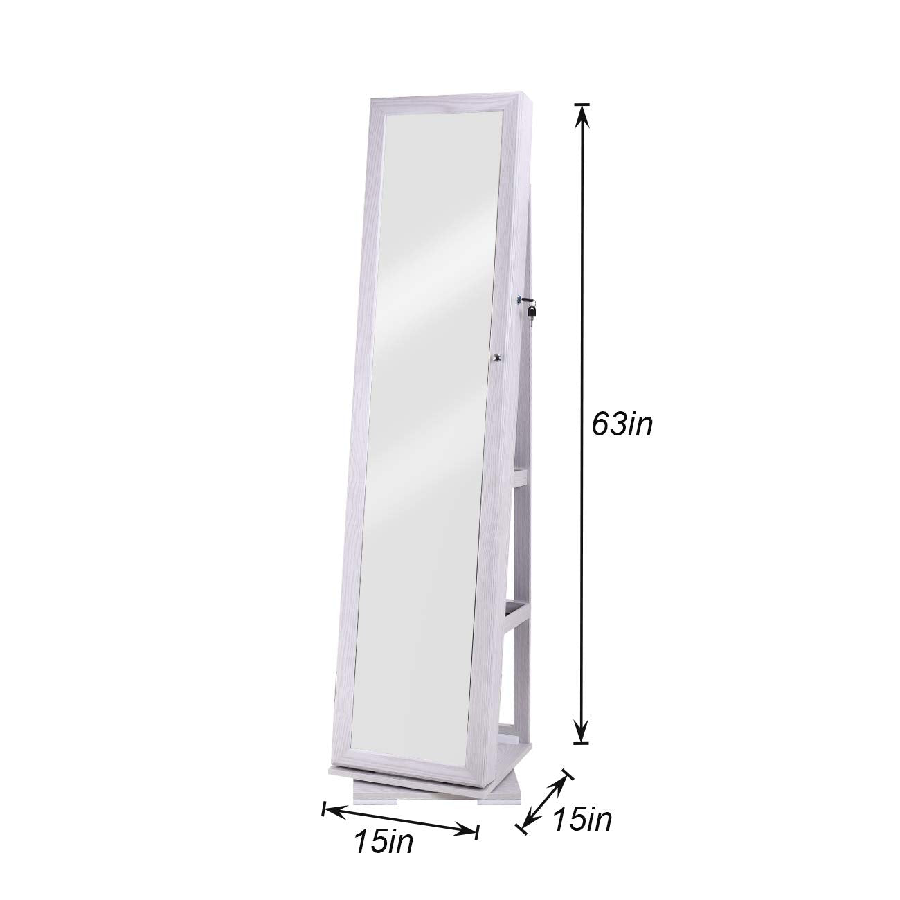 - 💍【Jewelry Cabinet Dimension】💍 Overall Size: 15(L) x 15(W) x 63(H) inches with swivel base, full length mirror, small mirror and jewelry organizer inside, shelves for bags behind. Full Length Mirror: Perfect dressing mirror of modern design, view your image from head to toe.