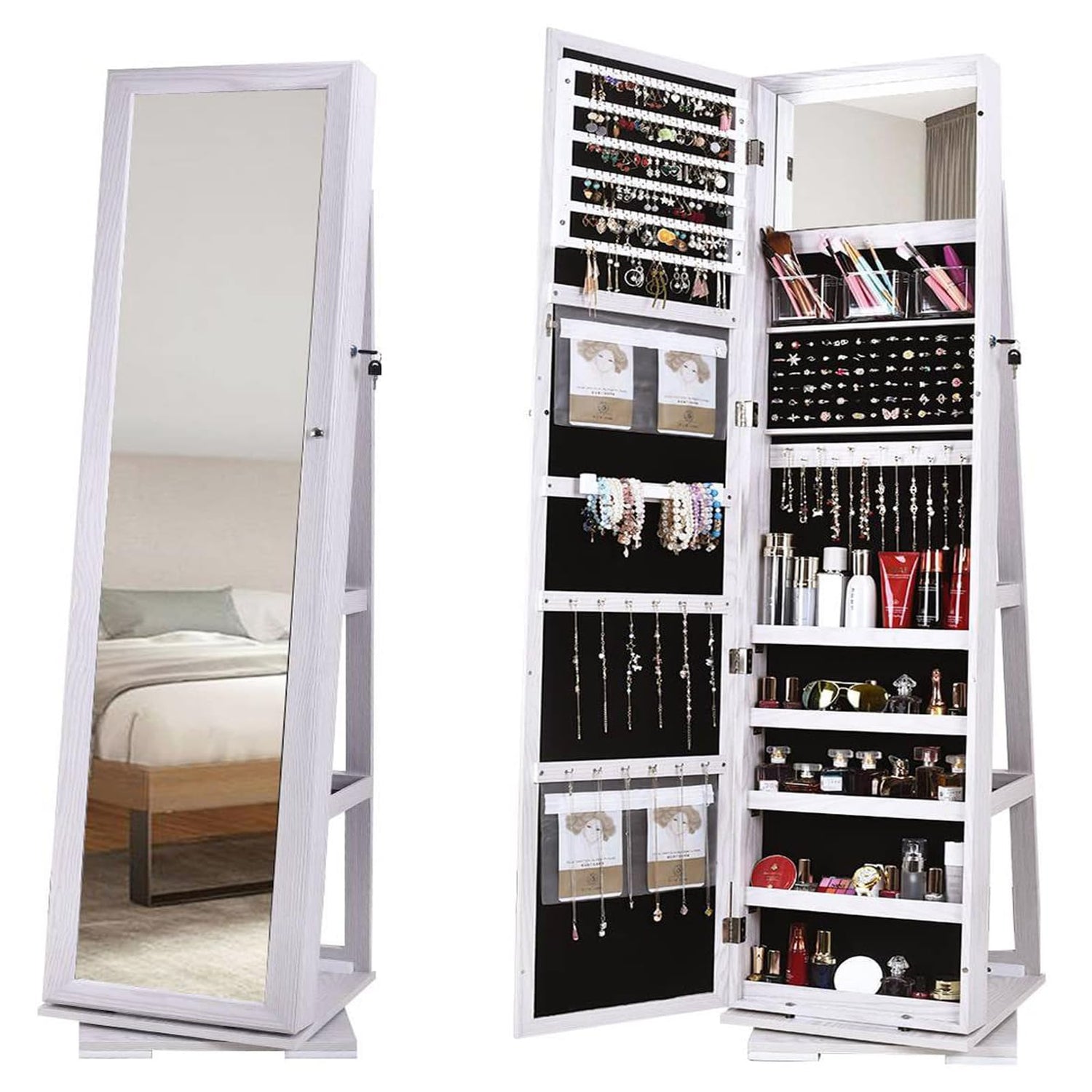 SDHYL Rotating Jewelry Cabinet with Mirror, Full Length Wooden Storage Armoire with Lock