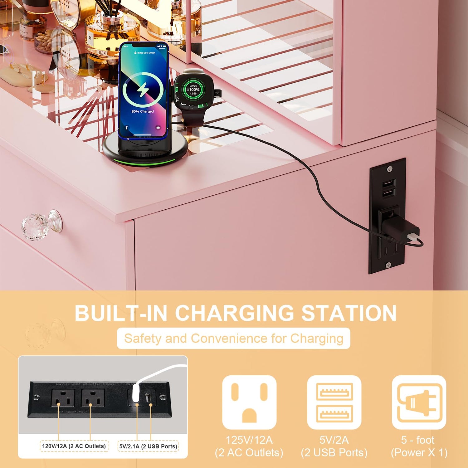 - [Convenient Charging Station]: Equipped with a built-in charging station featuring two power outlets and two USB ports, our vanity table keeps your devices like hair dryers, phones, and styling tools powered up and ready to go, enhancing your daily convenience.