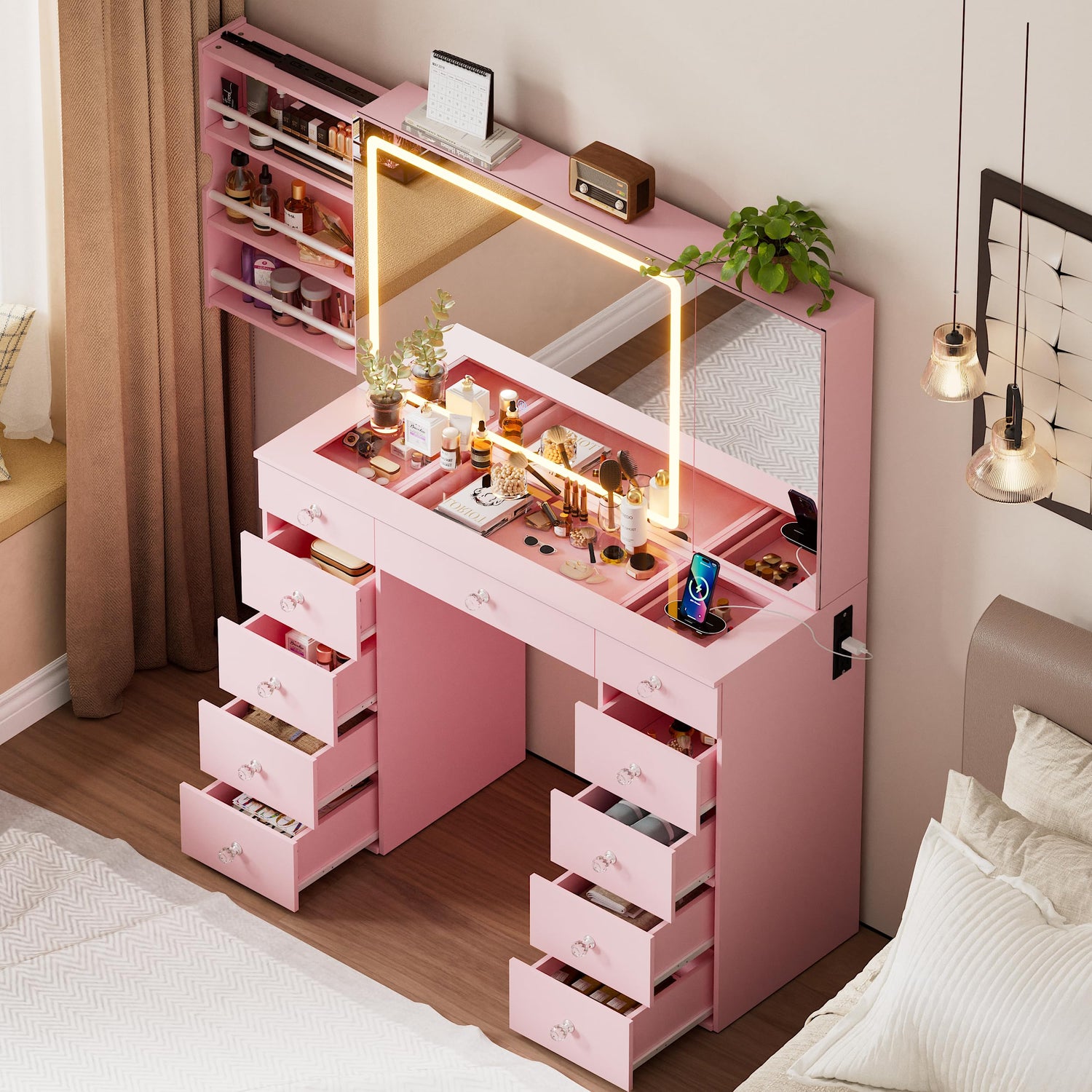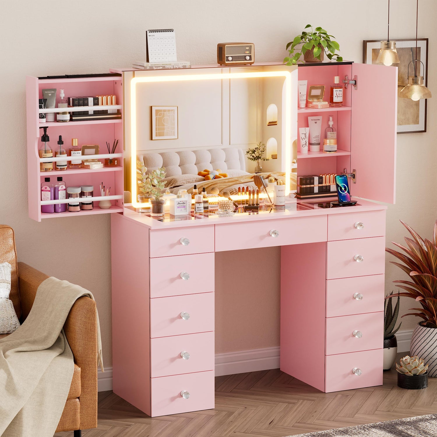 SDMY 46" Makeup Vanity with Large LED Mirror, Glass Tabletop Vanity Desk, 11 Storage Drawers, Hidden Storage Behind Mirror, Charging Station, Bedroom Vanity with Mirrored Cabinet (Pink)