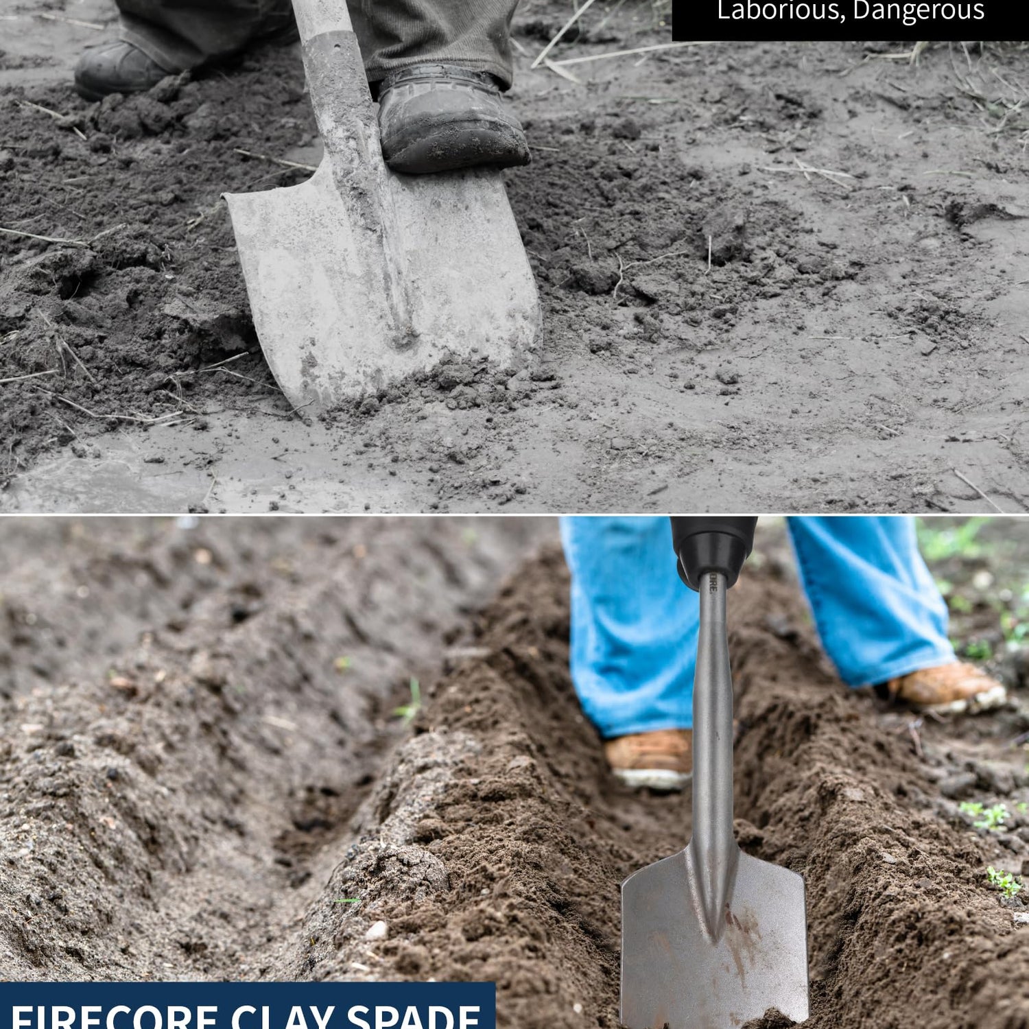 - WIDE APPLICATION: This clay spade is made to power through your most demanding earthworks and ground preparation tasks like digging, trenching, tunneling, trimming, and general excavation on clay, hard-packed gravel, adobe, sandstone, rock-hard soil, frozen dirt, etc. Should not use this tool on concrete or asphalt.