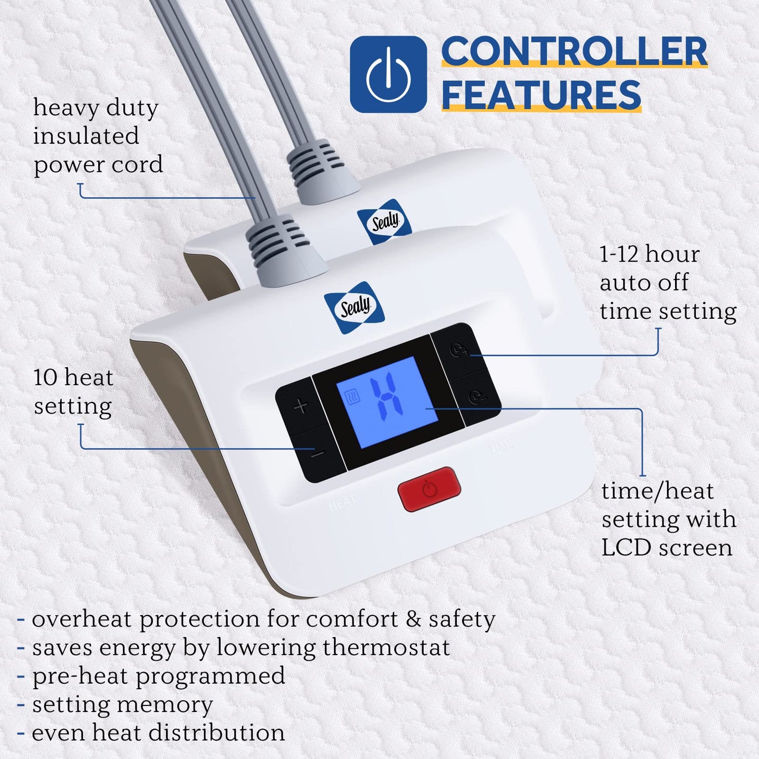 - 💎【DUAL CONTROLLER】 Sealy zoned heated mattress pad cove is equipped with dual controller which support 1-12 hour time settings and 10 heat settings (87-126°F) for customer's comfort which is very easy to use. The electric mattress pad has pre-heat program and setting memory. After testing, it can be quickly and evenly heated to 126°F in 20 minutes at a room temperature of 68°F. Different room temperature may affect heating effect.