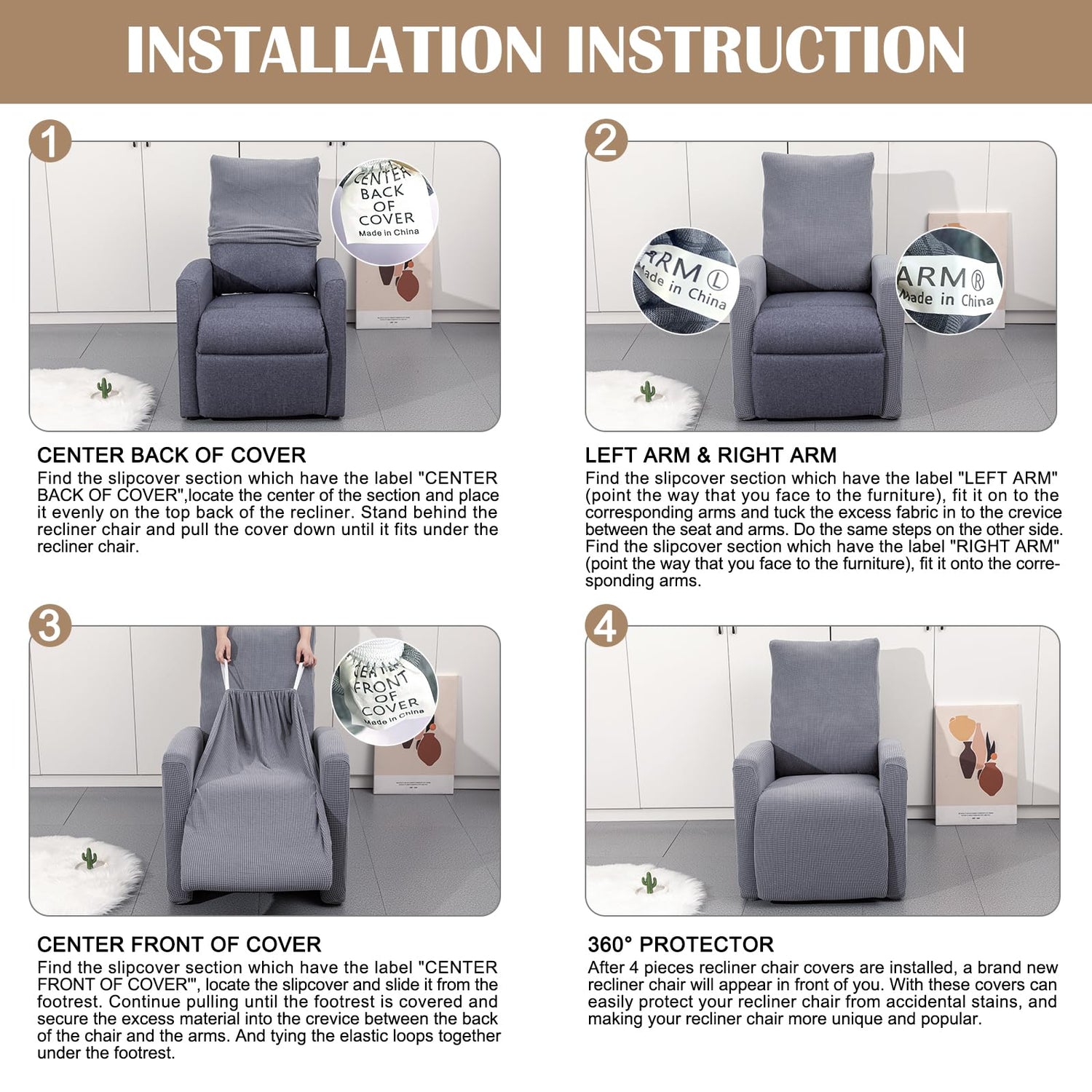 - 【EASY TO INSTALL & CARE】Each of our cover is marked with Introduced label, 2 pieces covers with "ARM " is for armrest, 1 piece cover with "CENTER FRONT OF COVER "is for seat cushion, 1 piece cover with "CENTER BACK OF COVER "is for Backrest. You only need to find the corresponding label, and then install it according to the installation steps in our picture. WASH TIPS: SearchI rocking recliner chair cover is removable, washable and machine washable. Tumble dry low. Do not iron and bleach.