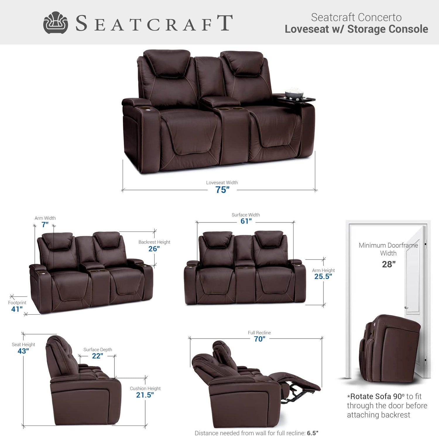 Seatcraft Concerto Heat & Massage, Italian Leather Loveseat w/Storage Console, Power Headrest, Power Recline, Brown