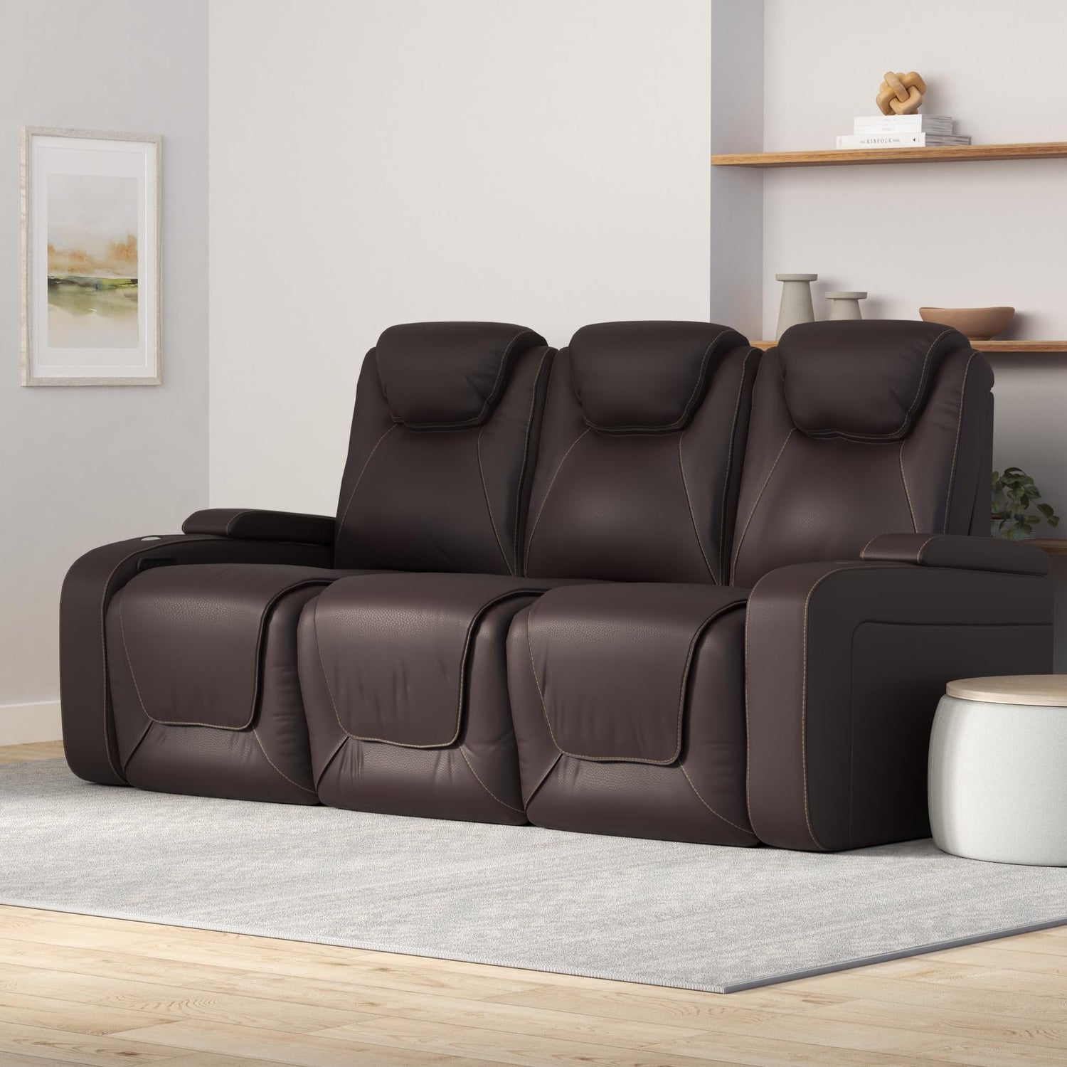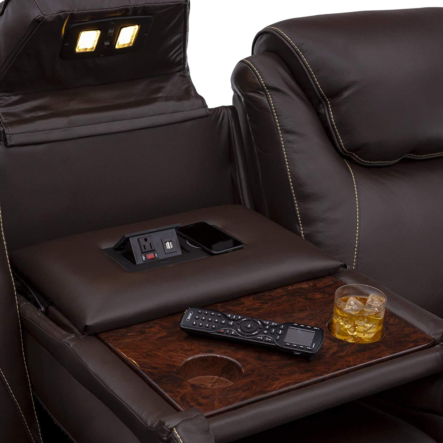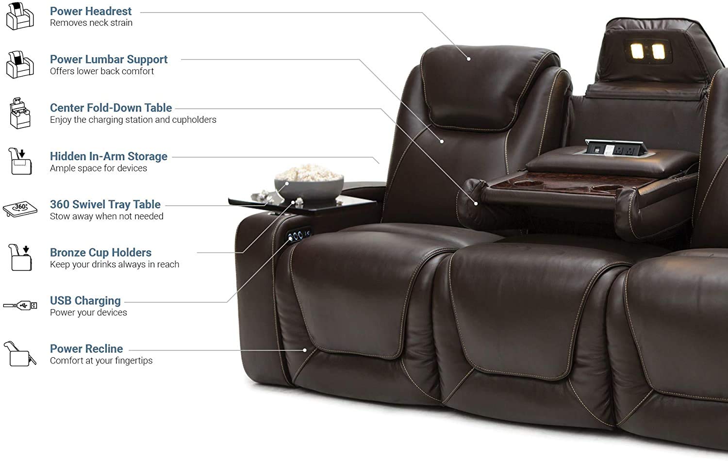 Seatcraft Vienna Home Theater Seating - Living Room - Italian Leather - Power Recline - Power Headrest - Powered Lumbar - AC USB Charging - Cup Holders - (Sofa with Fold Down Table, Brown)