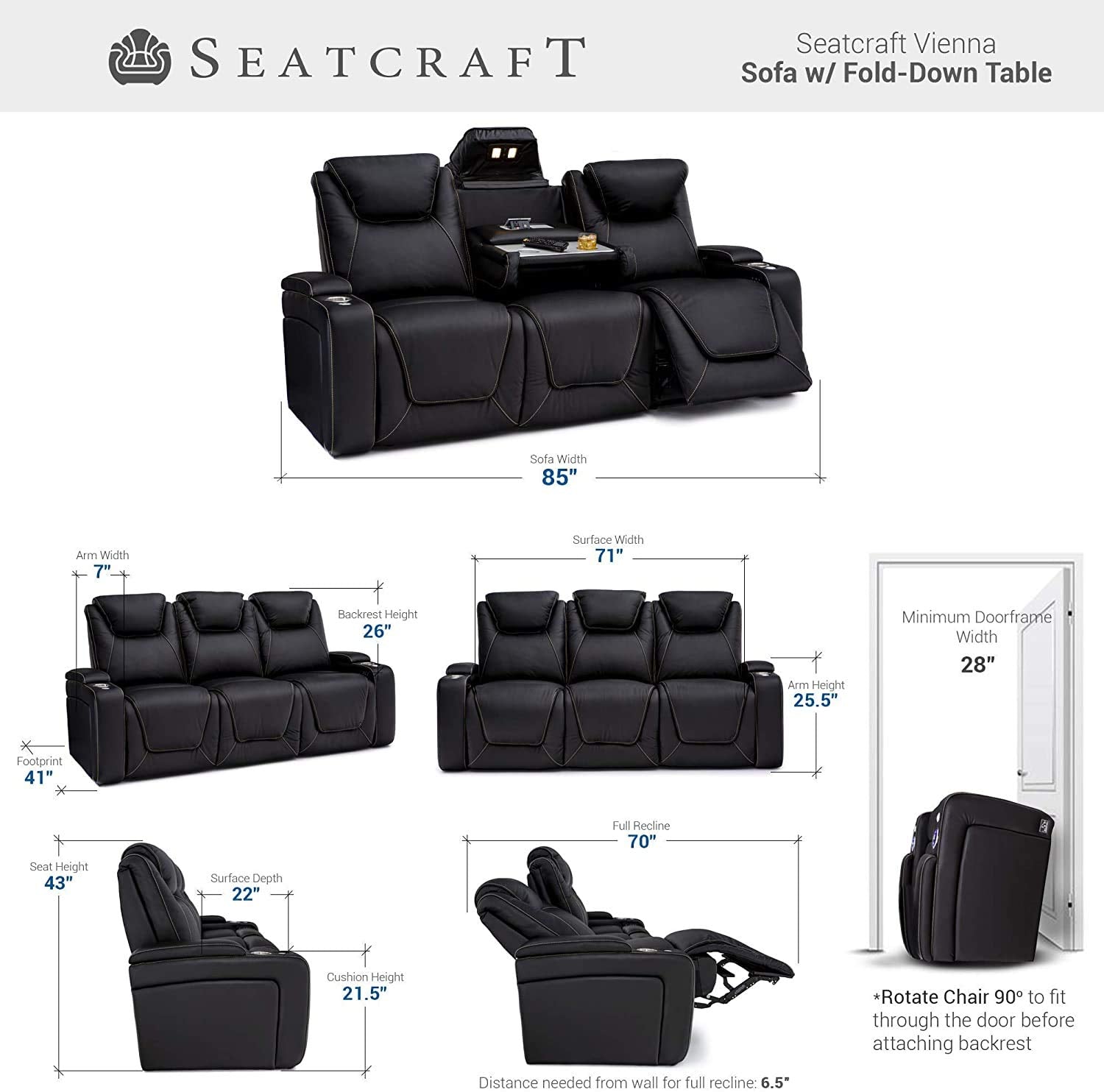 Details: The Seatcraft Vienna sofa and Loveseat collection incorporating elements from the most popular chairs, padding architecture, configurations, and features in demand, the Seatcraft Vienna offers a reliably satisfying experience, in every aspect. It's a chair that has something for everyone. Owing to its internal padding, construction, and design, chairs built with its' infrastructure are often described as Seatcraft most comfortable chairs, owing most of its design to one of Seatcraft original Flagship chairs, the equinox. With its deceptively comfortable design beneath its' rigid-looking frame, layers of supportive padding soothe you into innumerable conveniences; power lumbar, powered headrest, usb-charging ports, in-arm storage, cup holders, power recline, and so much more. A powerful piece of furniture for anyone's living room, the Vienna can fit in anywhere to please anyone with its range of features, Top-Grain leather 7000 construction, and the sleek, refined appearance tying it all together. Features: top grain leather power recliners> adjustable powered headrest> adjustable powered lumbar support center fold-down table with charging station and cup holders> hidden in-arm storage compartments> stainless steel cup holders> USB charging> wall Hugger recline item specifications: sofa Dimensions: 43" h x 85" W x 41" d fully reclined: 70" d wall Hugger: 6.5"package includes: 1 x sofa 2 x tray tables assembly: furniture arrives Partially assembled with backrests detached for easy-moving