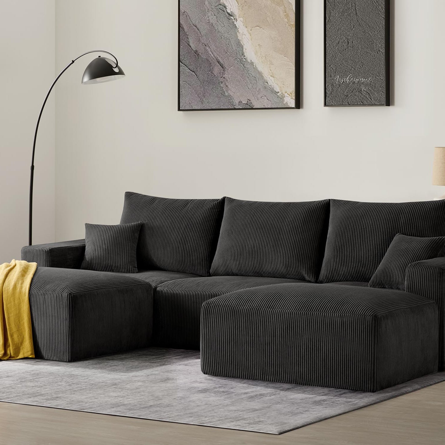 Sectional Modern Sleeper Sofa Couches for Living Room-113'' Black 3 Seater U-Shaped Lounge Cloud Couch-No Assembly Modular Corduroy Convertible Sponge Compression Sofas with Chaise for Home House