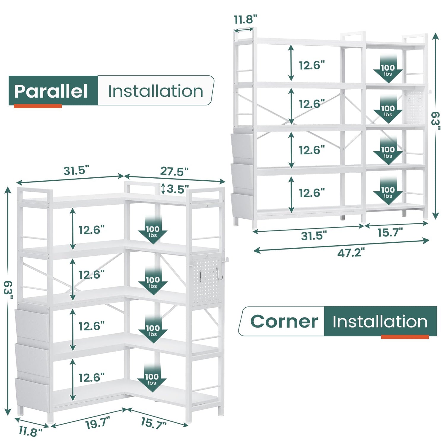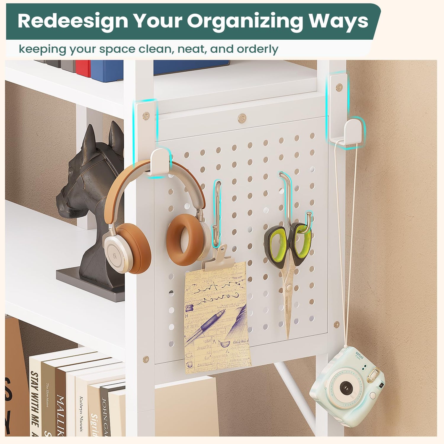 - 【Multifunctional Bookshelf】5-tier bookshelf with storage pockets, pegboard and 4 hooks can provide enough space to meet your display or storage needs, keeping daily items organized. This multifunctional bookshelf can be neatly tucked into a corner or opened along the wall to maximize your space. You can flexibly switch between bedroom bookshelf, living room display shelf and balcony plant shelf.