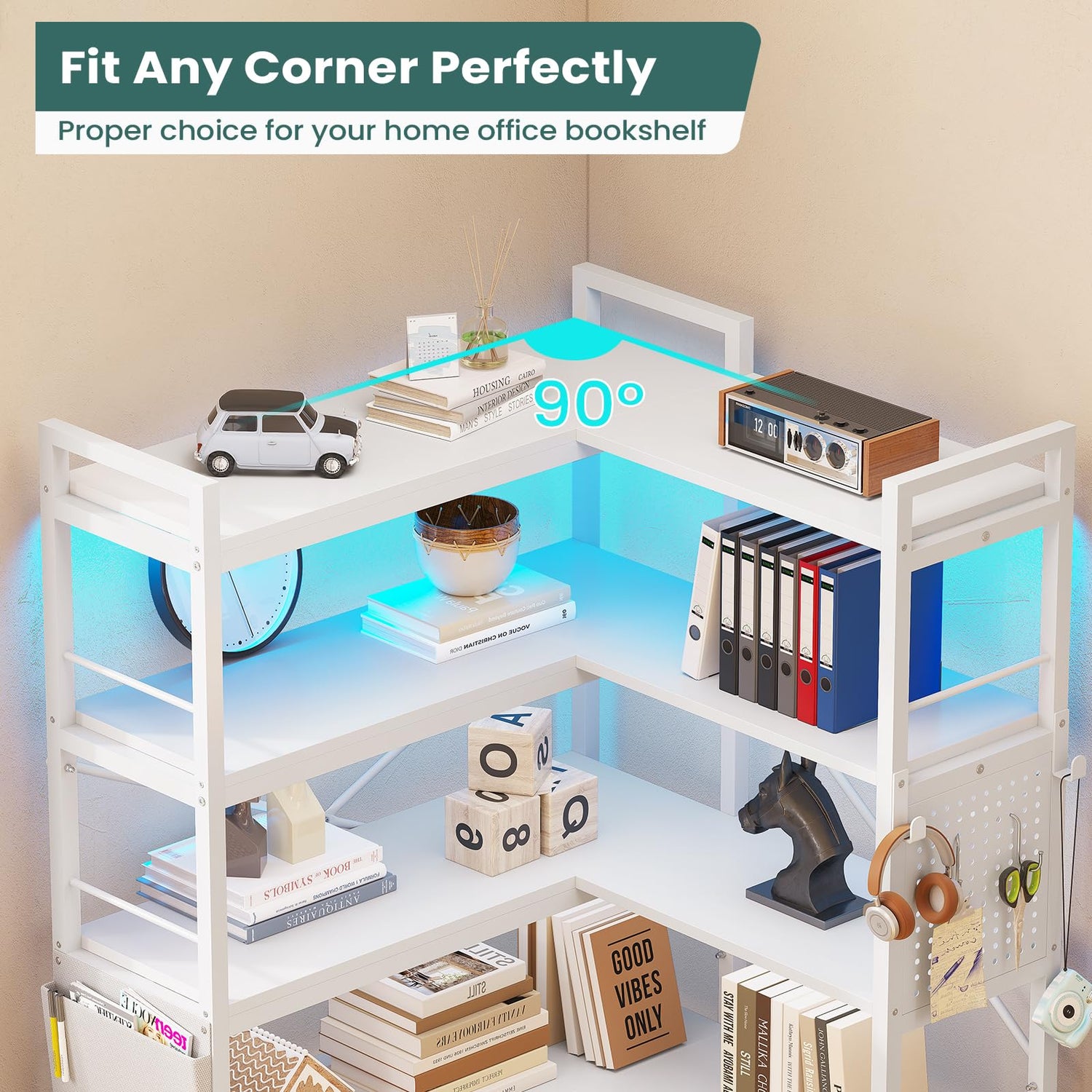 SEDETA 5 Tier Corner Bookshelf, Modern Corner Bookcase, Convertible Bookshelf with Storage Bag, Pegboard & LED Light, Tall Bookshelves for Bedroom, Living Room and Home Office, White