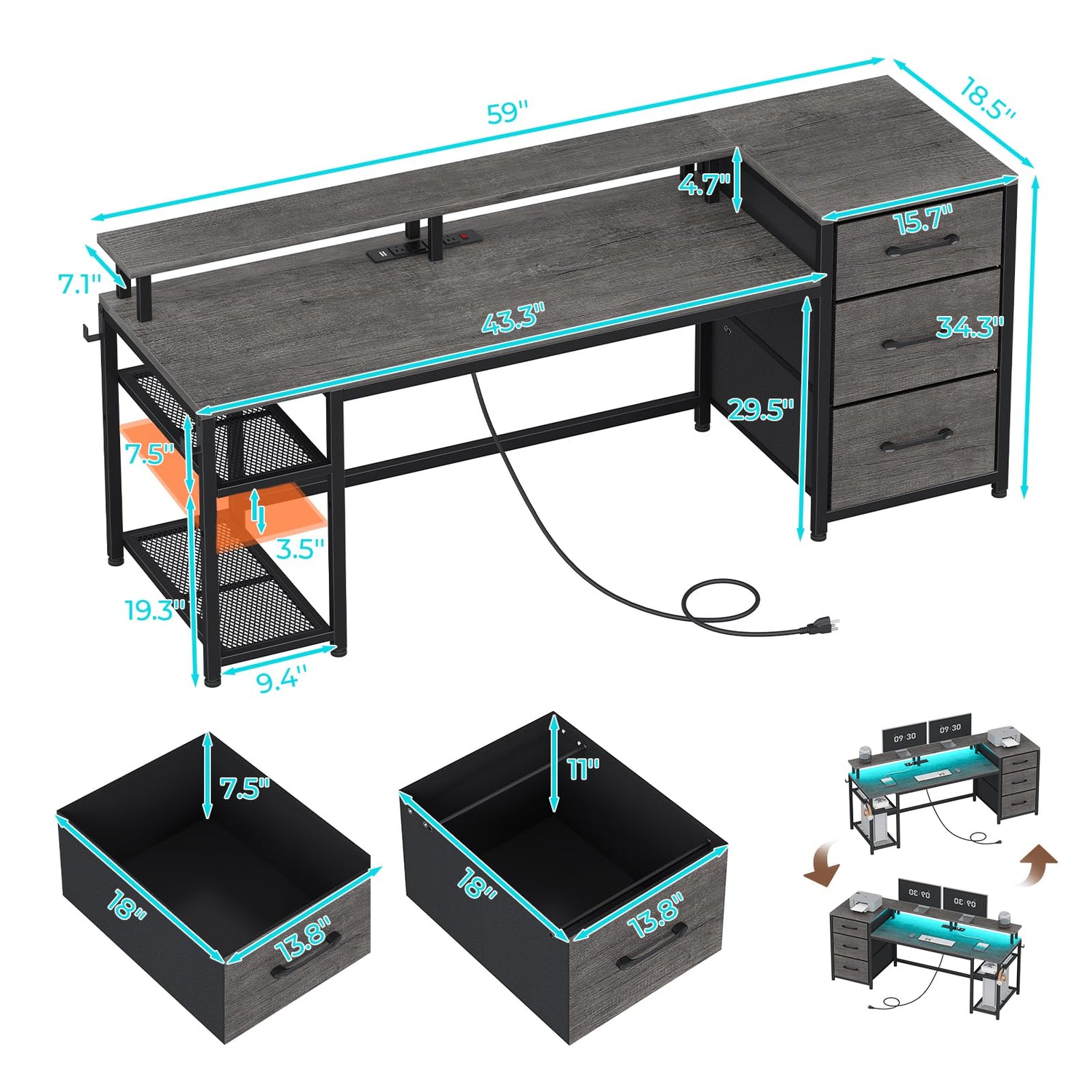 - 【Multifunctional Computer Desk】This desk with a reversible storage shelf is equipped with a 59" large tabletop, power outlet, 2 fabric file drawers, 1 small fabric drawer, LED light, long monitor stand for dual monitors, 2-layer adjustable CPU shelves and 2 L hooks. The office desk can be placed in different locations depending on the type of house and is the best choice for small rooms or limited spaces.