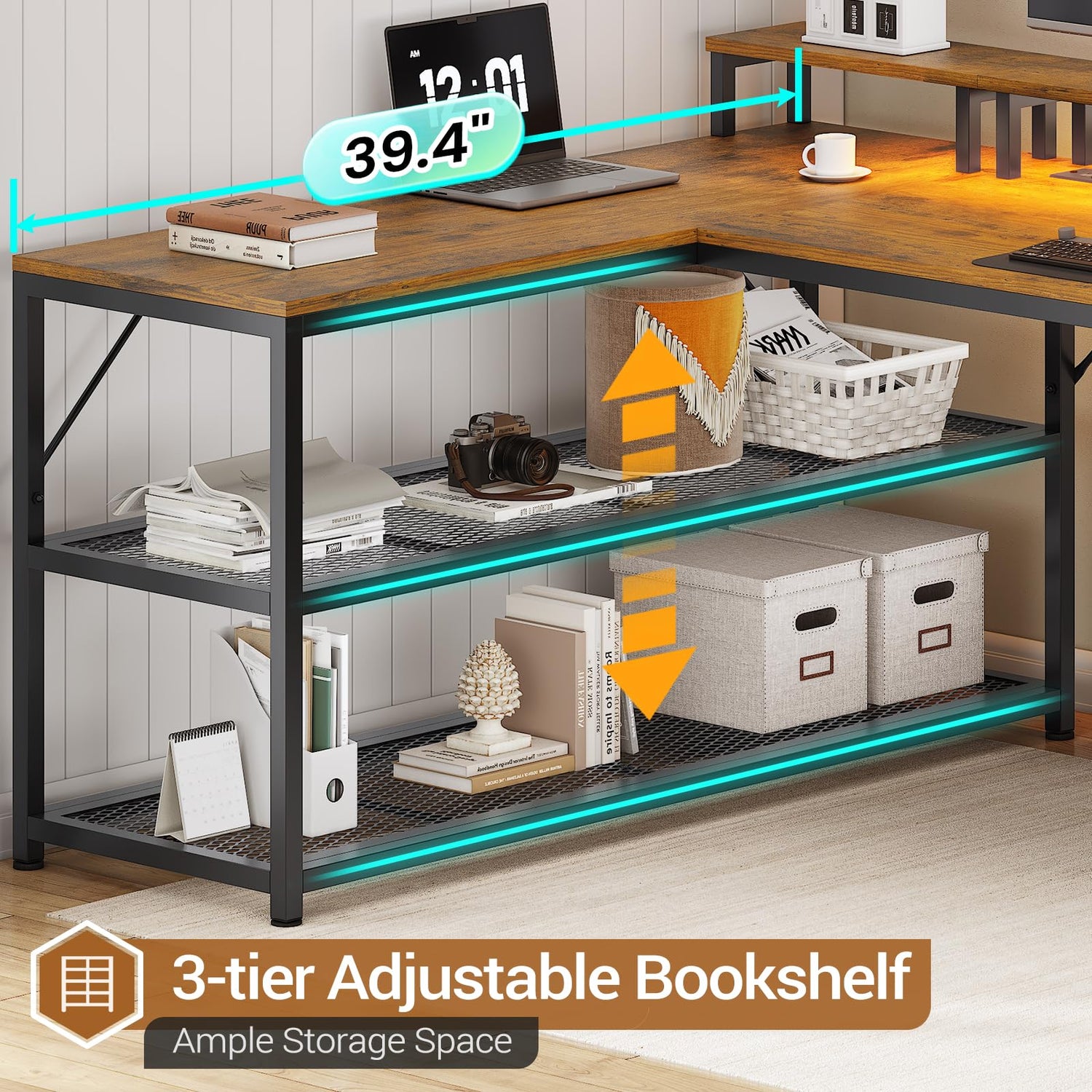 SEDETA 67" L Shaped Desk with Drawers, Computer Office Desk with Storage Shelves & Power Outlet, Reversible Gaming Desk with LED Lights for Home Office, Rustic Brown