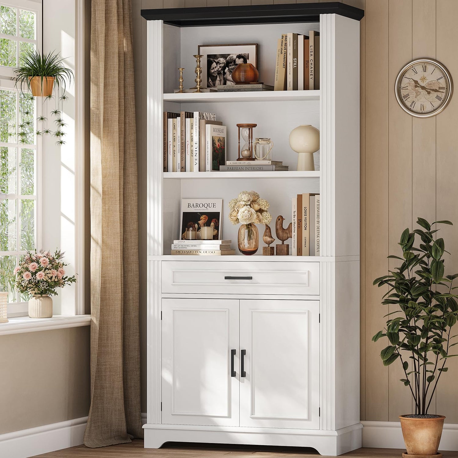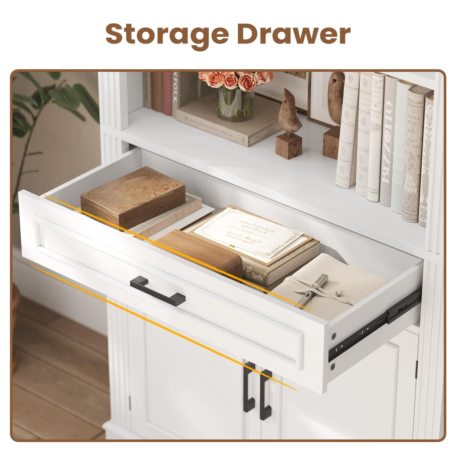 SEDETA Farmhouse Bookshelves and Bookcases with Doors and Drawer, Bookshelf with Storage, Floor Standing 6 Shelf Display Storage Shelves 70 in Tall Bookshelf for Home Office, Living Room, White