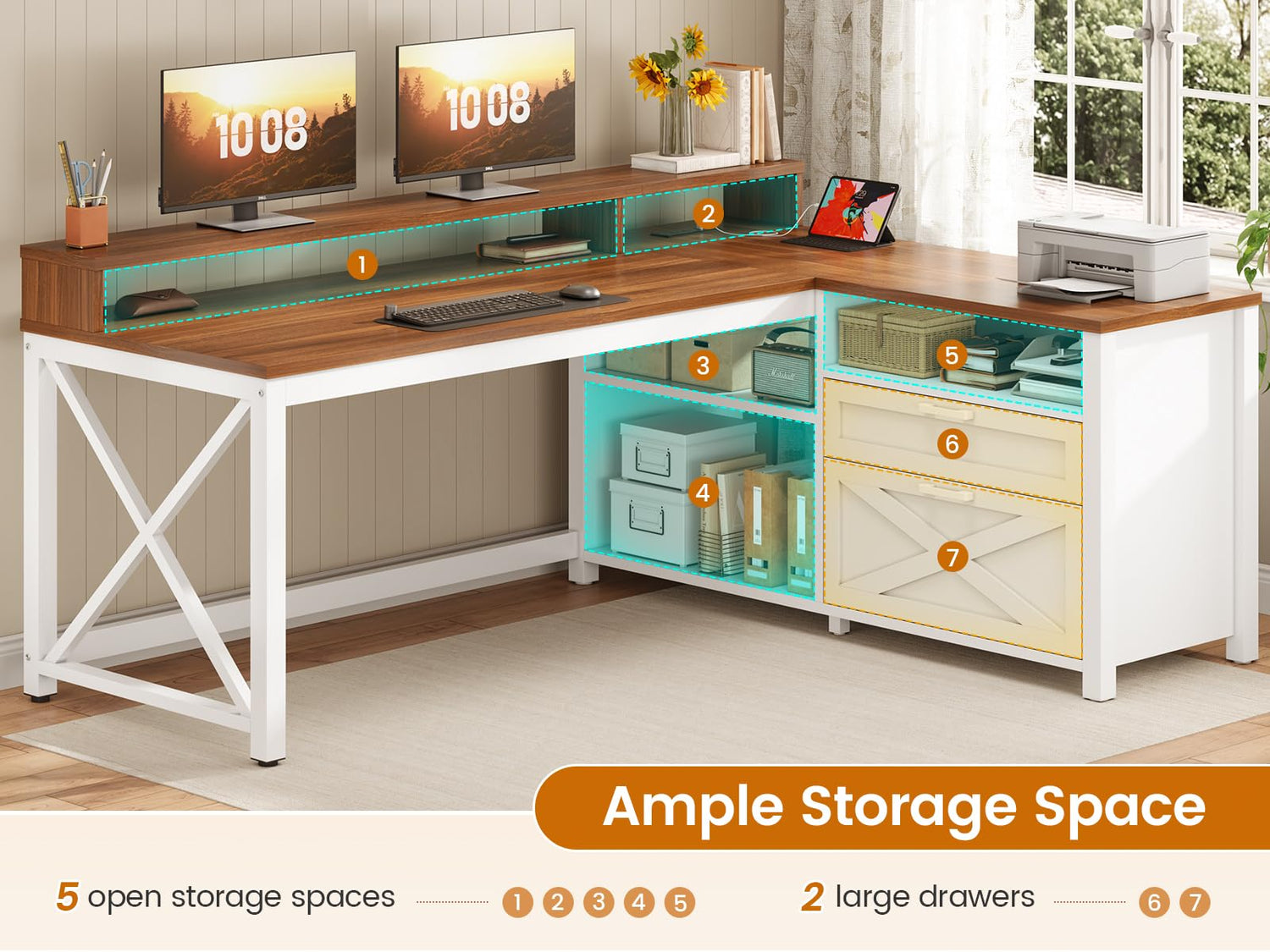 - 【What You Get】Create a versatile workstation that’ll meet all your needs with this all-in-one l shaped desk with drawers, monitor riser, storage shelves, power outlet and LED lights. It's finished on all sides for versatile placement throughout your office.
