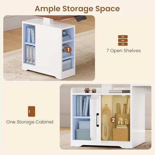 - 【Ample Storage Space】Coming with a file drawer, 2 drawers,1 storage cabinet and 7 open shelves. File cabinet can hold letter/A4/legal files. This solid constructed l shaped standing desk with drawers could hold printers, scanners, fax machines and any other office machines, keeps printer or scanner within easy reach of your desk to free up work space.