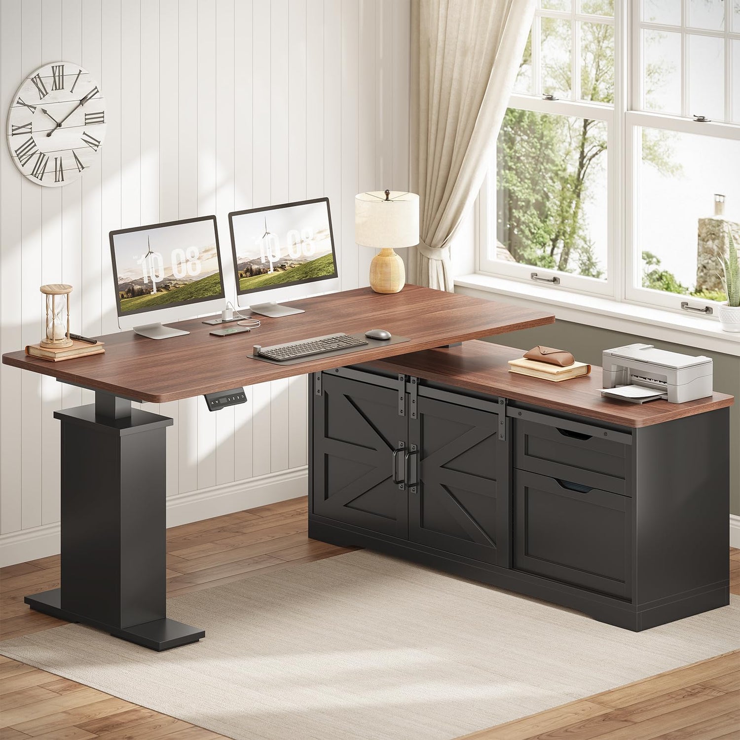 - 【Ample Storage Space】Sedeta l shaped standing desk features 2 drawers and a storage cabinet, offering ample space for files, books, and office essentials. The large file cabinet fits letter/A4/legal documents. The smooth sliding tracks on the drawers and barn door withstand thousands of uses, ensuring effortless opening and closing.