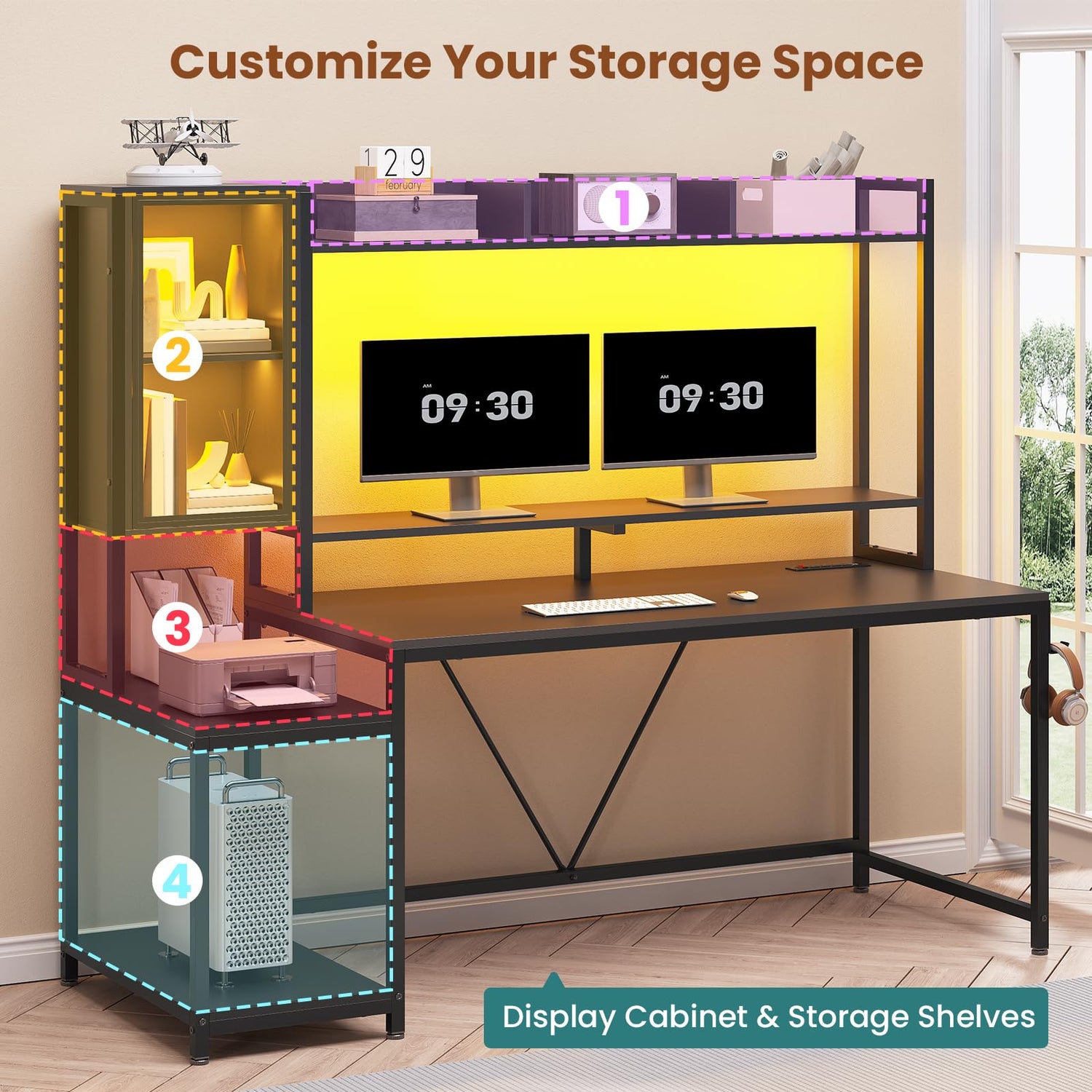 SEDETA Gaming Desk, 60'' Gaming Desk with Hutch and LED Lights, Computer Desk with Storage Shelves, Large PC Gamer Desk with Display Cabinet, Monitor Stand, Power Outlet for Home Office, Black