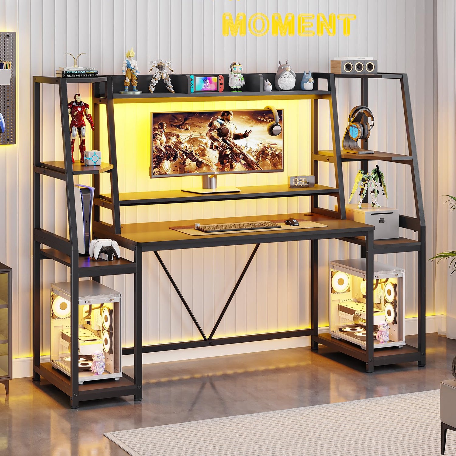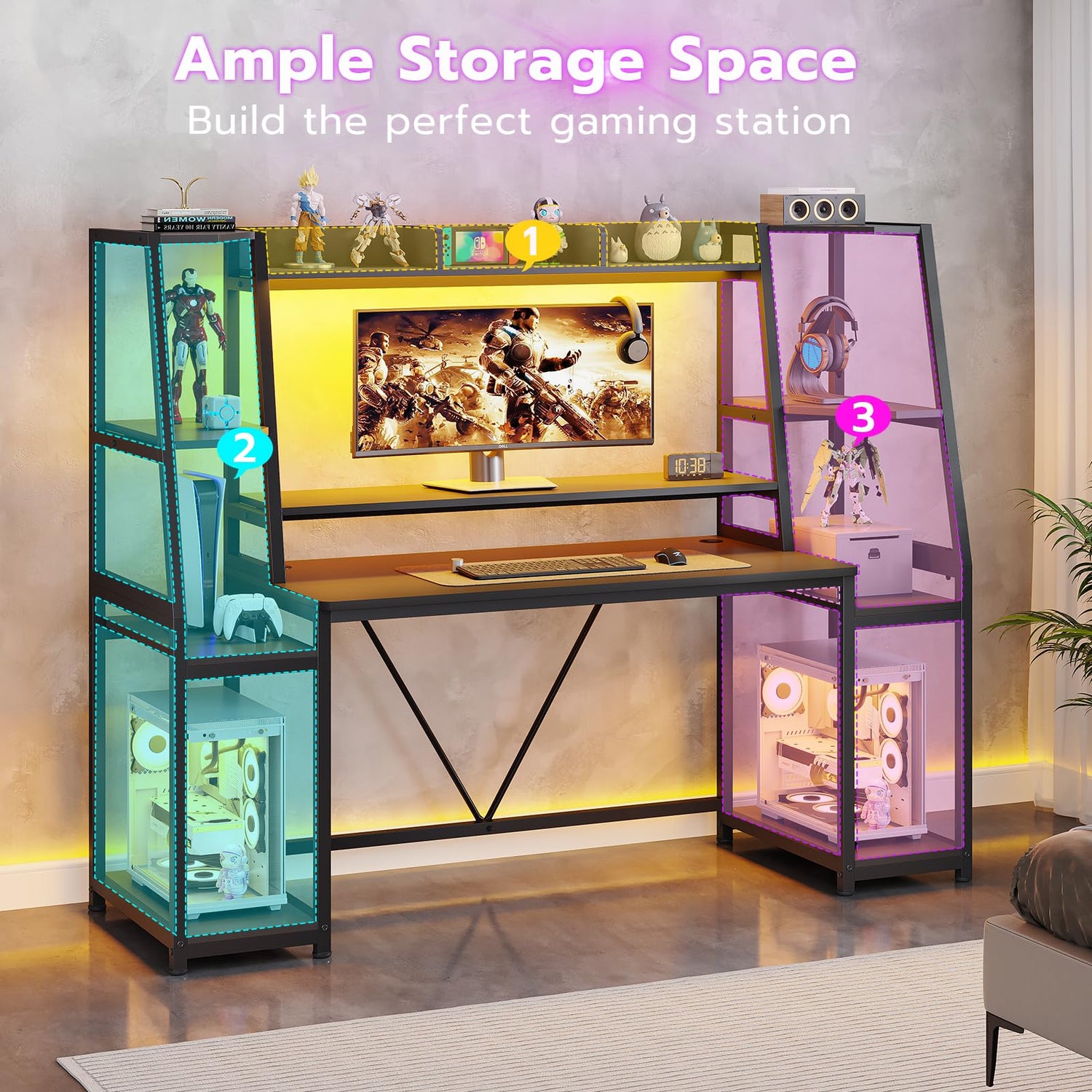 - ✔【Multifunctional Desk for Gamer】How do you make the perfect gaming station? This ergonomic gaming Computer desk comes with a monitor stand, LED lights, two large storage shelf, hutch, CPU holder. All features of this gaming desk provide a comfortable gaming experience and working environment. However it's not only a gaming desk, actually it’s a multi-functional workstation desk perfect for playing games, working or studying. Popular Gift for Boy/Male/E-Sports Lover Left Side.