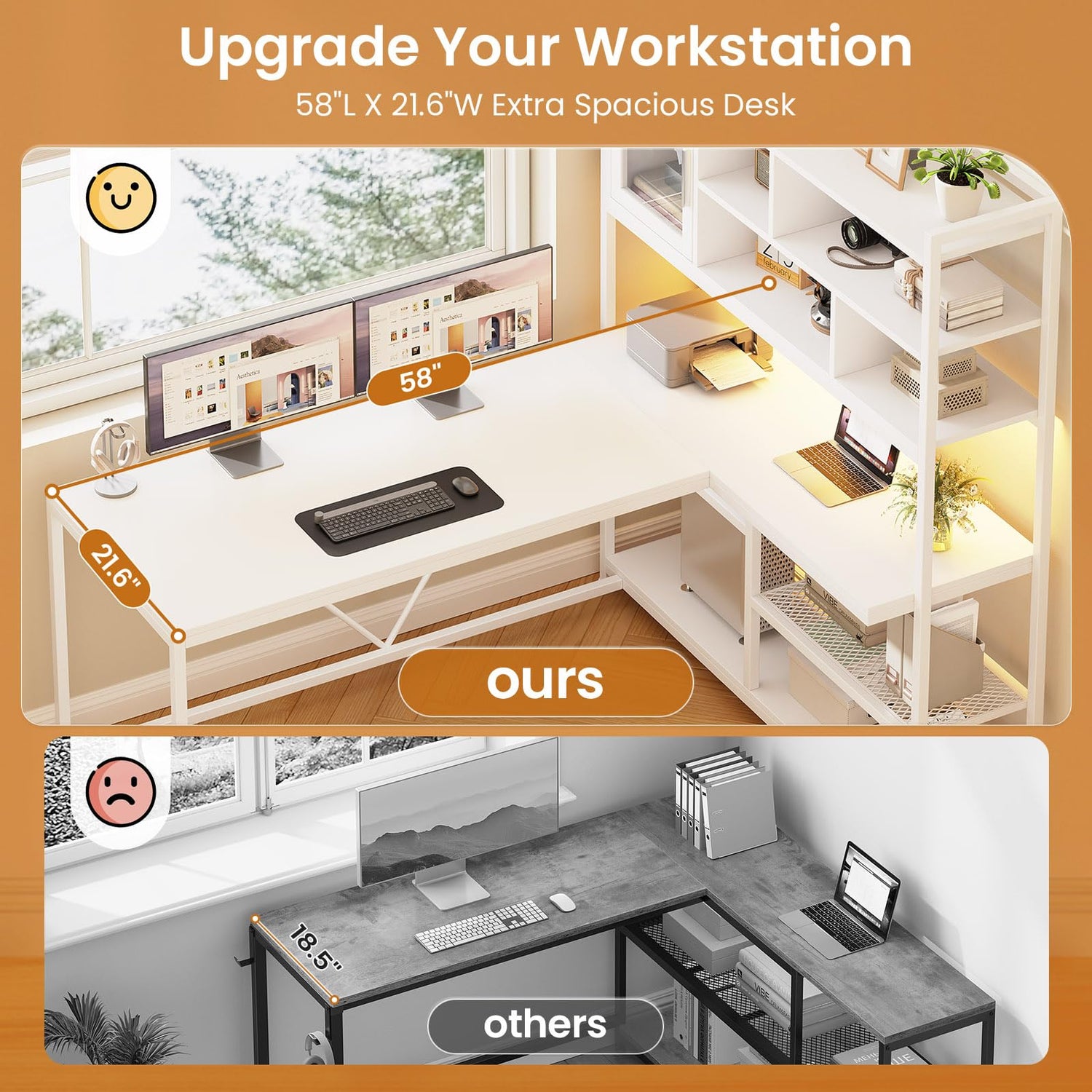 - 【Reversible Desk】With reversible design, this home office desk can be installed in 2 directions according to your needs. The L shaped computer desk could hold two desktop computers and one notebook computer. The desktop size is 58"L*21.6"W. The simple design and multi-function storage to meet all needs. An ideal desk for small rooms or limited spaces to create excellent home office space.