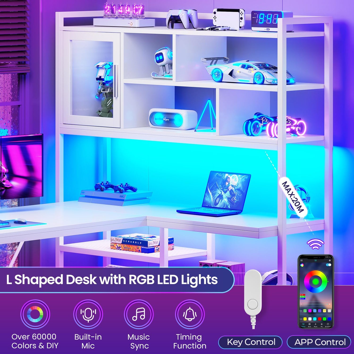 - 【Large Storage Space】L shaped desk with 7 tiers open shelves, 1 glass storage cabinet, This 61" tall bookshelf has 7 shelves , which offer enough space to store your daily items, books, files, printer stand, CPU stand or game figure, collect trophies, and souvenirs.