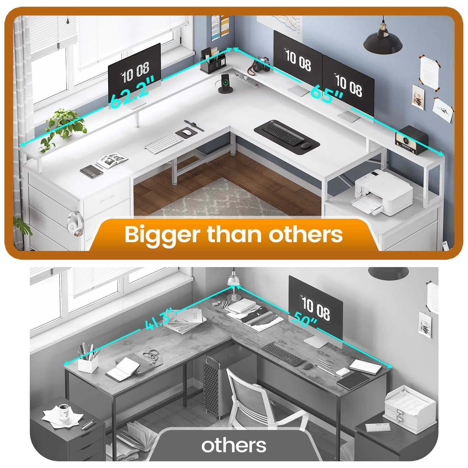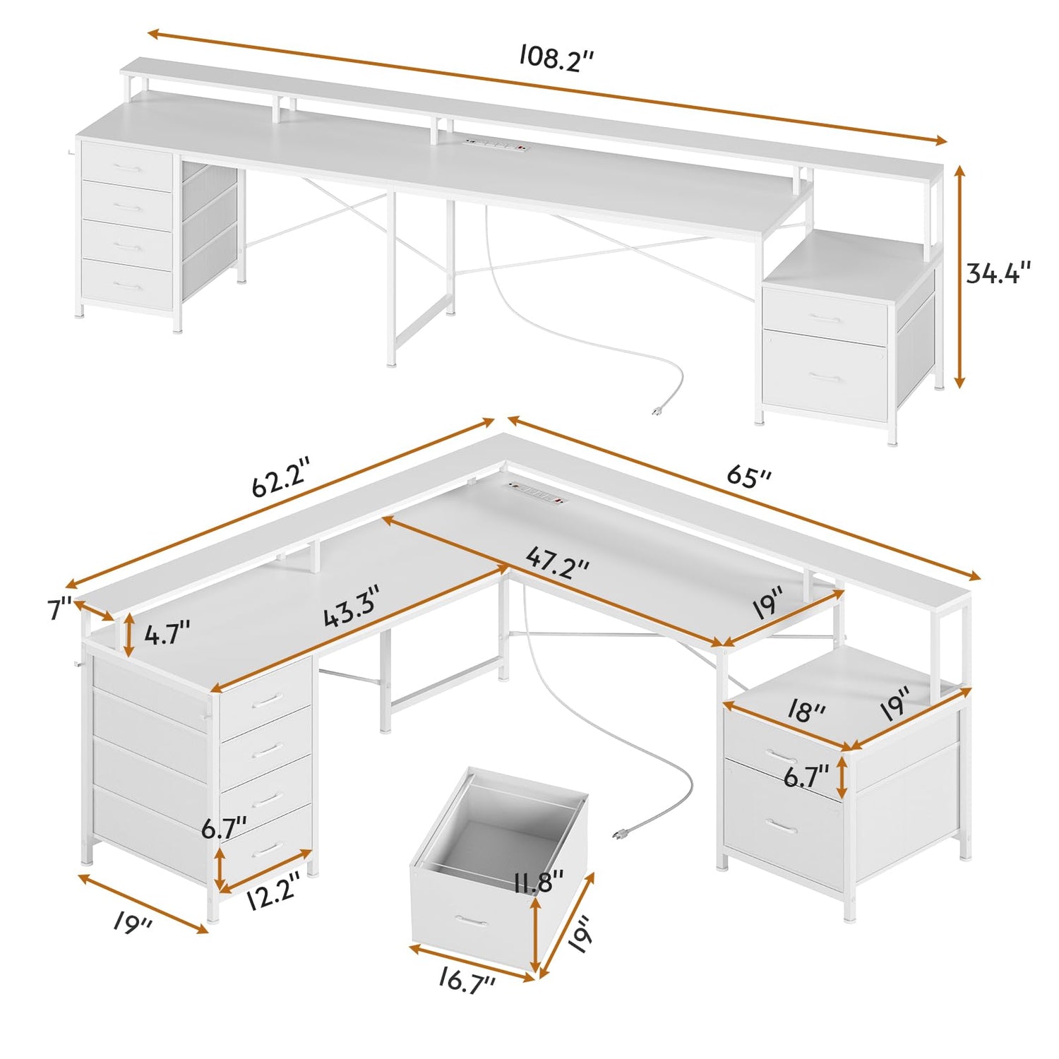 - 【Ideal Space】This computer desk has a spacious desktop. The desktop size is 65"L*19"W and 62.2"L*19"W or 108 inch two person desk. The printer rack can be used for printers of any size commonly seen on the market. The L shaped computer desk could hold three desktop computers and one notebook computer. This computer desk can also be freely deformed into a long square or L-shaped desk according to your use needs.