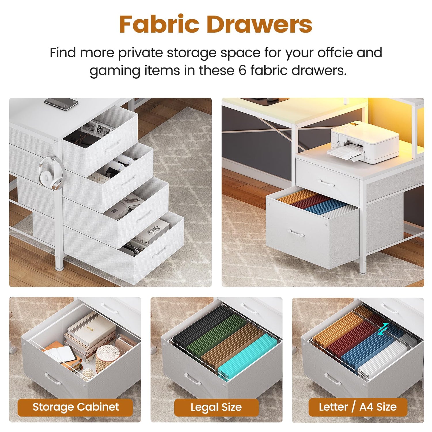 SEDETA L Shaped Desk with 6 Drawer, 108" Home Office Desk with File Drawer & Power Outlet, Corner Computer Desk with Monitor Shelf, File Cabinet, Two Person Desk, Gaming Desk with Led Lights, White