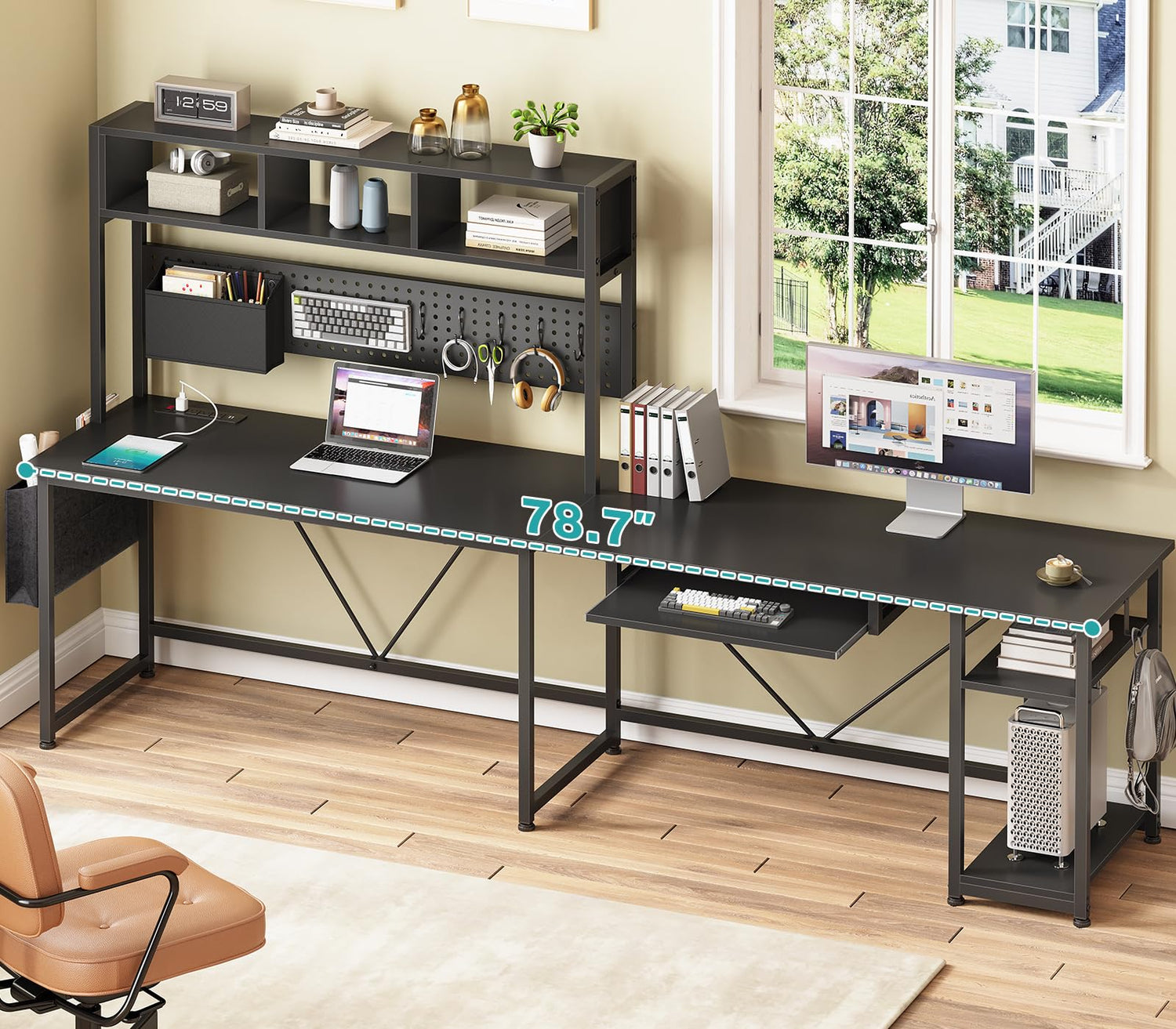 • 【Reversible Desk】 57.5 inch l shaped desk or 78.7 inch long office desk. The l Shaped desk is perfect for tucking into a corner, it can hold your computer, monitor, keyboard, files, books or CPU stand for home office. Or 78.7 inch two person desk can hold two-person studying or writing no interference. And the top hutch can place left or right according to your needs.