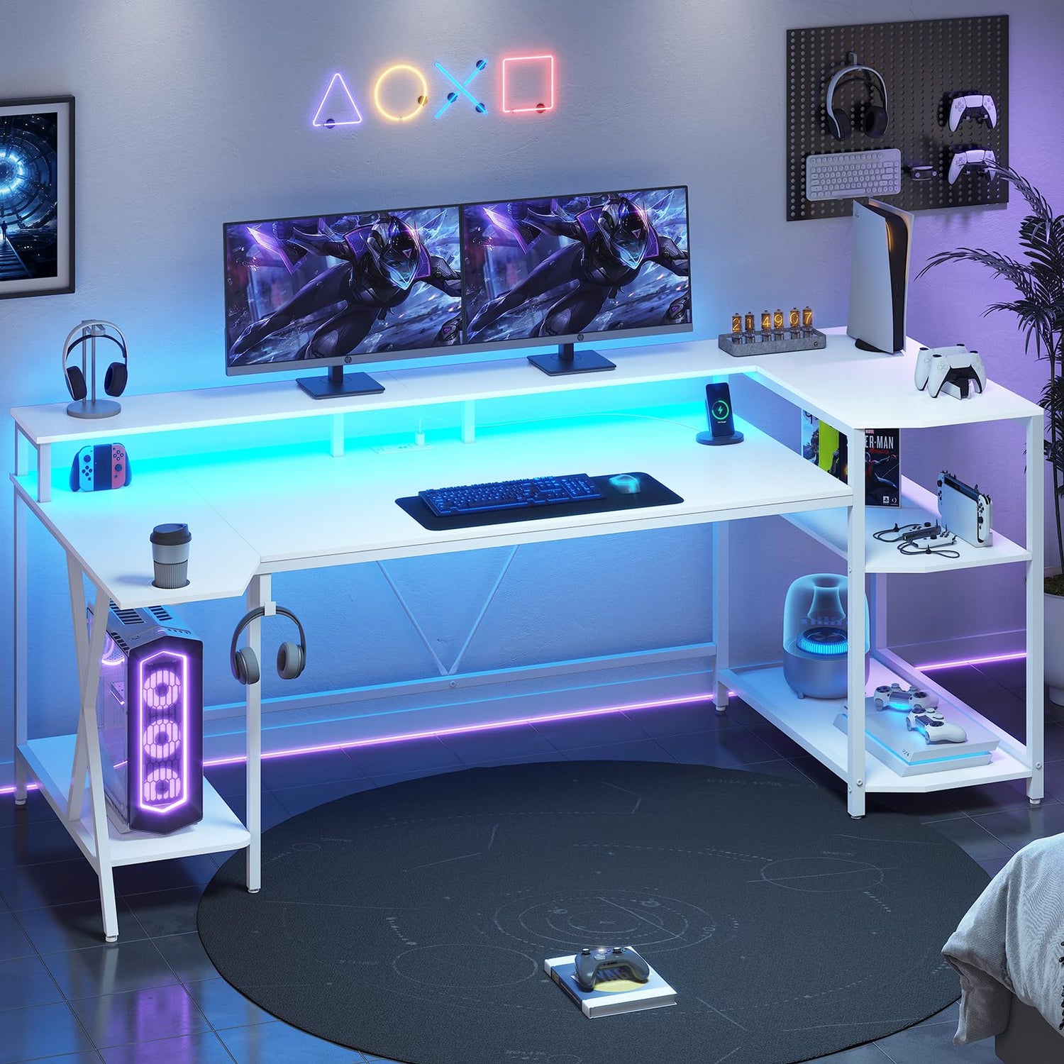 SEDETA White Gaming Desk 70.8'' with LED Lights and Storage Shelves, Computer Desk with Monitor Stand, Power Outlets and Cup Holder, Large PC Gamer Desk, Gaming Table for Bedroom, Living Room