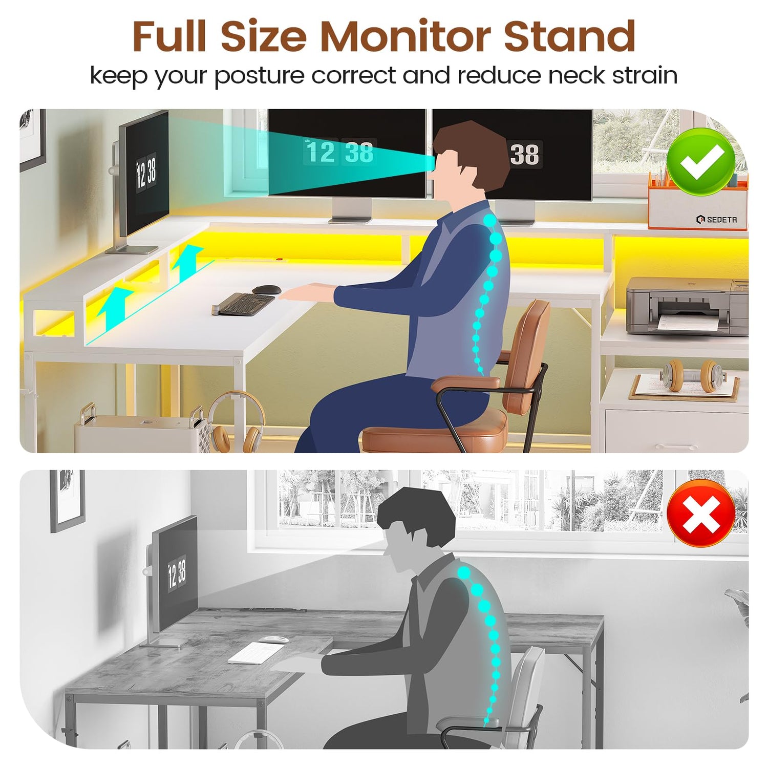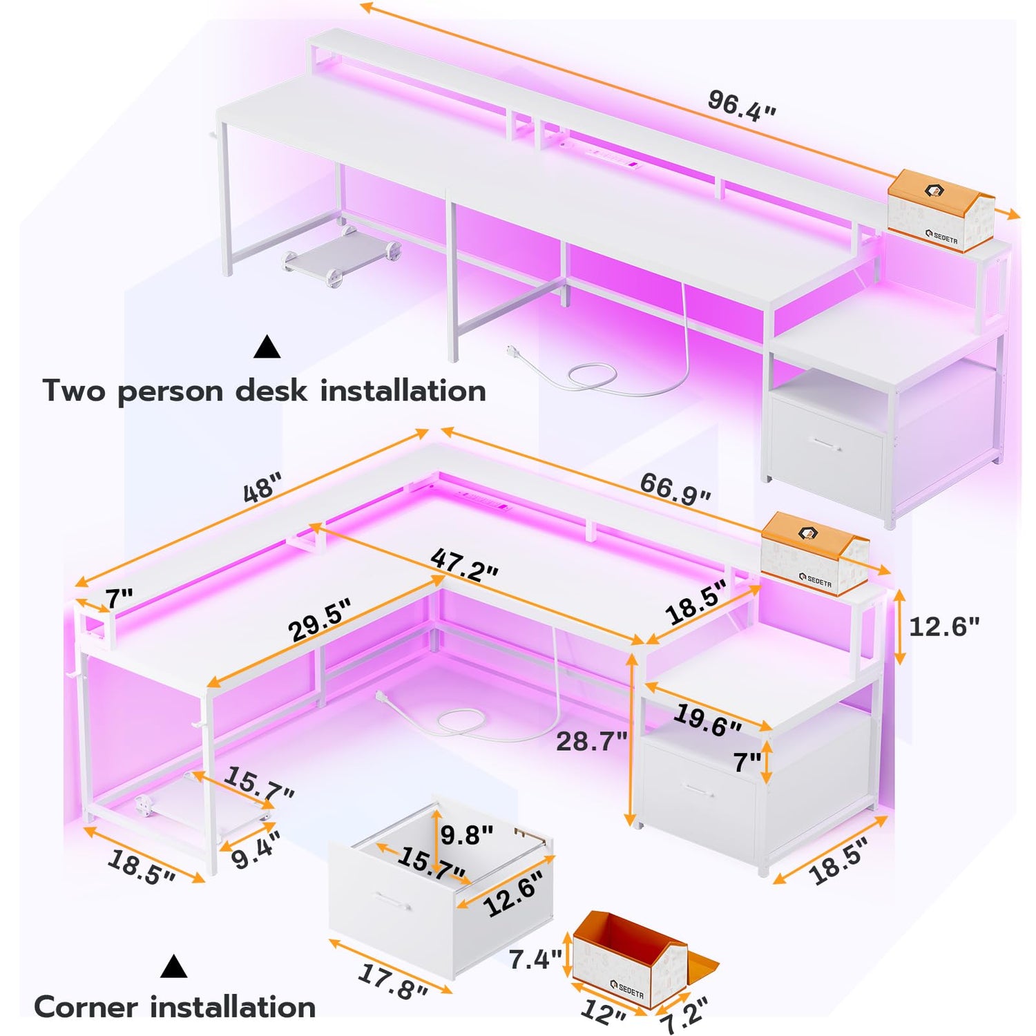 SEDETA White L Shaped Gaming Desk, 66" Home Office Desk with File Drawer, Power Outlet and Led Lights, Corner Computer Desk with Monitor Shelf, Printer Storage Shelves, for Two Person