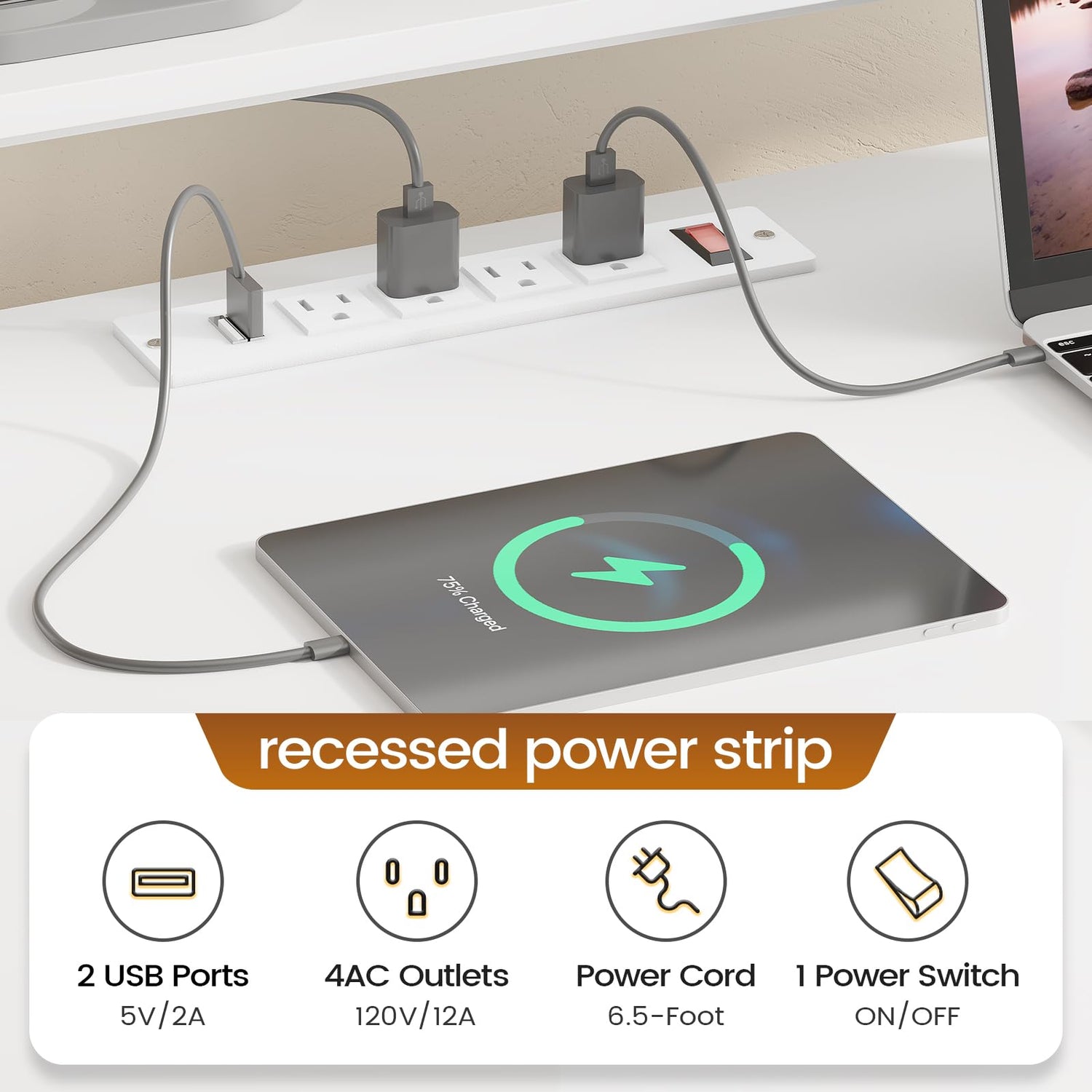 - 【For Health】The monitor shelf conforms to the ergonomic structure, which effectively reduces the pressure on the back and neck, so that you don't need to worry too much about health problems when you were working. At the same time, a headset hook is provided on the side, so that the headset is at your hand, and you don't need to worry about finding headphones for playing games.Our charging station includes 4-Outlet & 2 USB Ports to provide power for up to 6 devices simultaneously.
