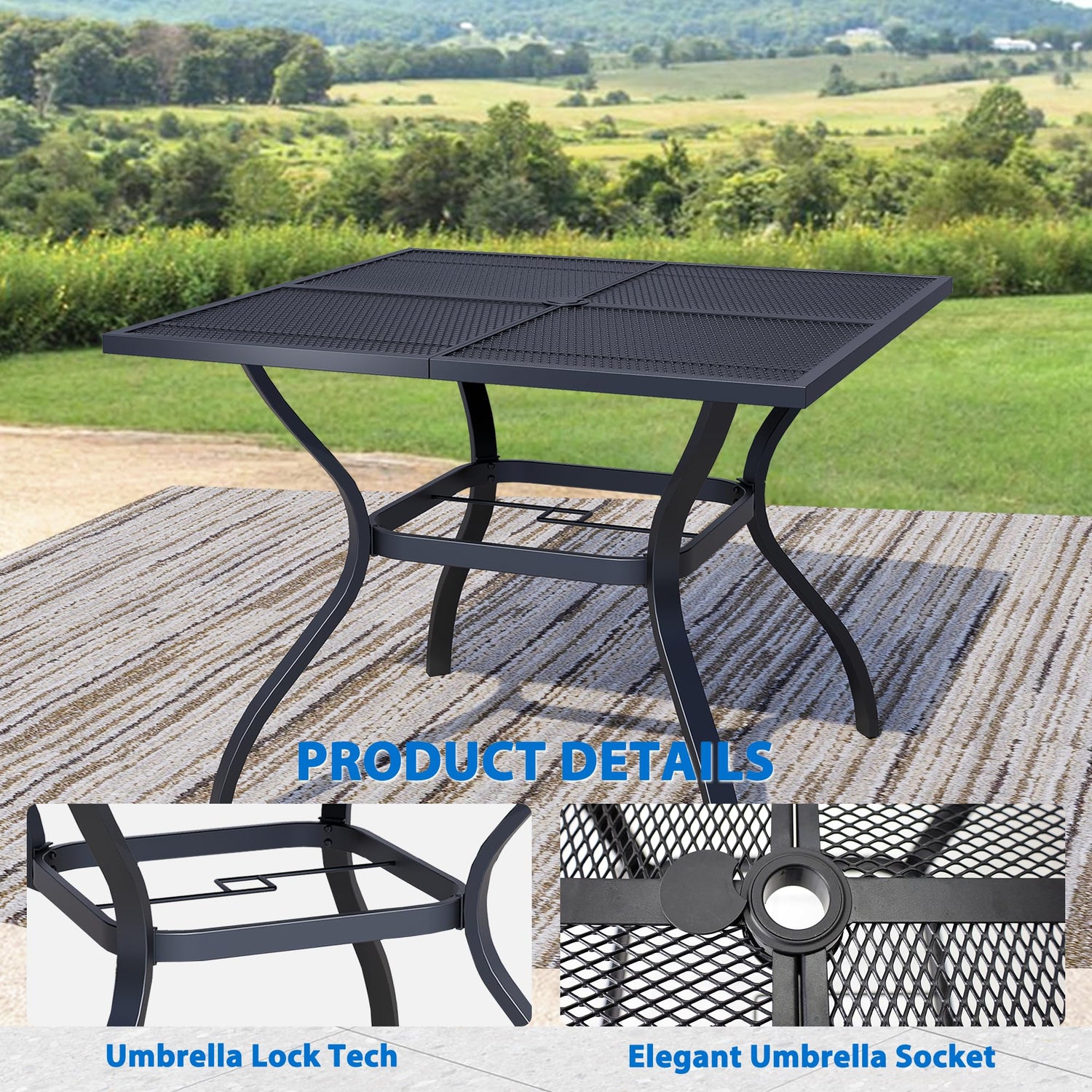 - 【Complete 5-Piece Outdoor Dining Set】This all-inclusive patio set includes a 37.6" square metal table with a center umbrella hole and four matching chairs, perfect for creating an elegant dining space in gardens, yards, or patios. The versatile design accommodates up to 4 guests for BBQs, parties, or casual meals