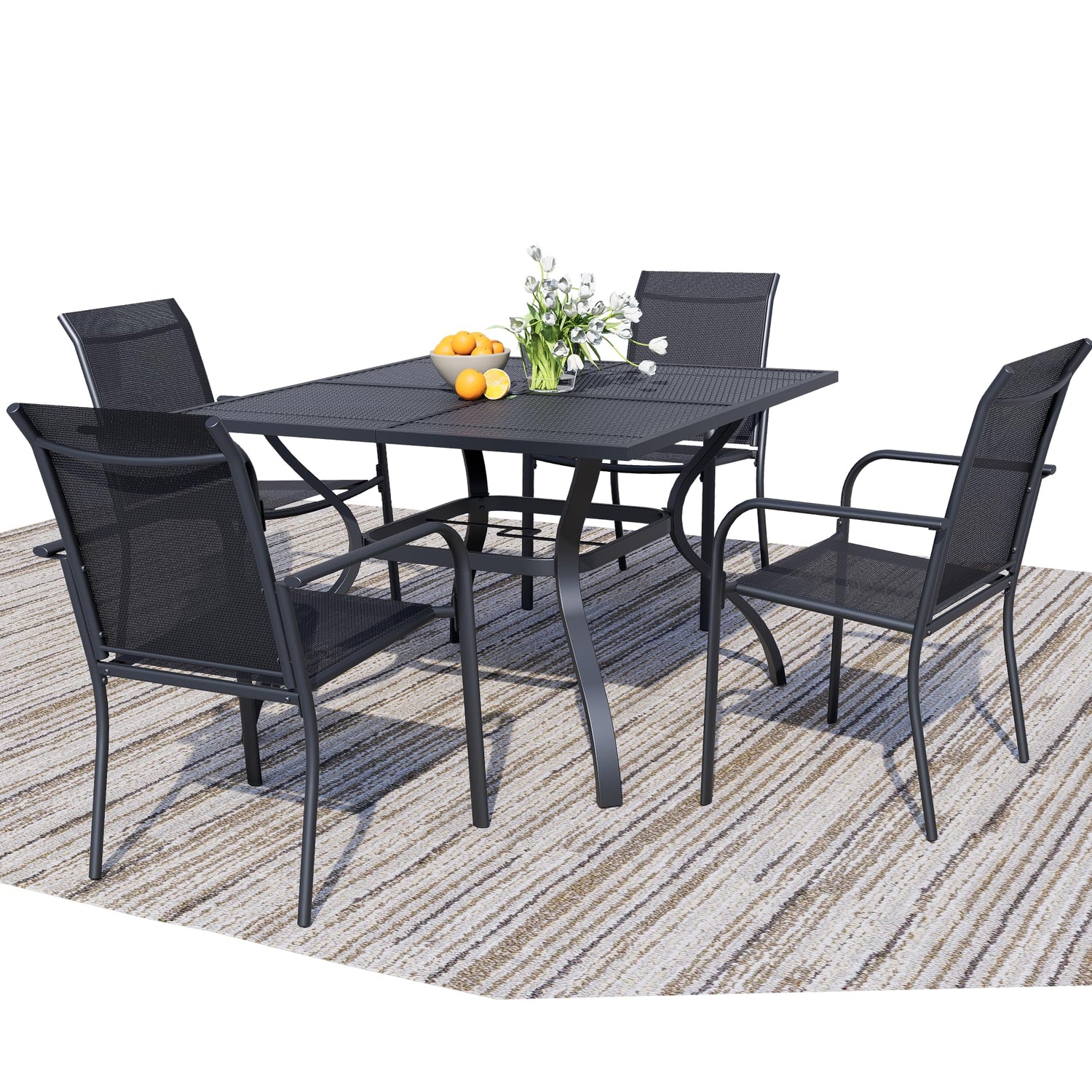 Seekverse 5-Piece Outdoor Dining Set, Square Metal Table with 4 Black Chairs, Black Patio Table with Umbrella Hole for Garden, Yard, Patio