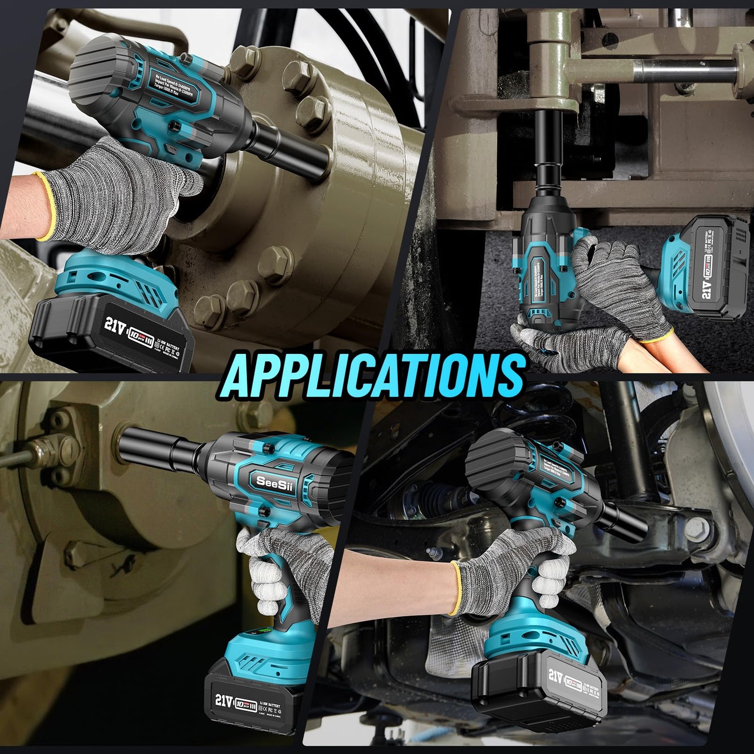 - A BEAST FOR VERSATILE APPLICATION: Ideal for Heavy-Duty Machinery. With a maximum torque of 1000 N.m / 738 FT-LB and 2400 RPM, Seesii 1/2 impact gun is specifically designed for heavy-duty jobs,this electric impact gun 1/2 drive can efficiently perform heavy equipment maintenance, major construction projects, agriculture machinery, pick-up trucks, rusted nuts & bolts, truck rv automotive repairs, etc