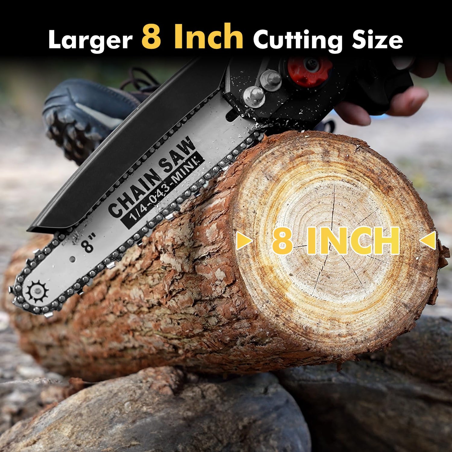 - So,why pick an 8 inch mini chainsaw instead of a 6 inch : With a larger cutting size, the 8-inch Mini Chain Saw effortlessly handles bigger wood. Experience greater power and versatility, making it the superior choice for any demanding task. Don't settle for less when you can have the best—upgrade to the 8-inch chainsaw today