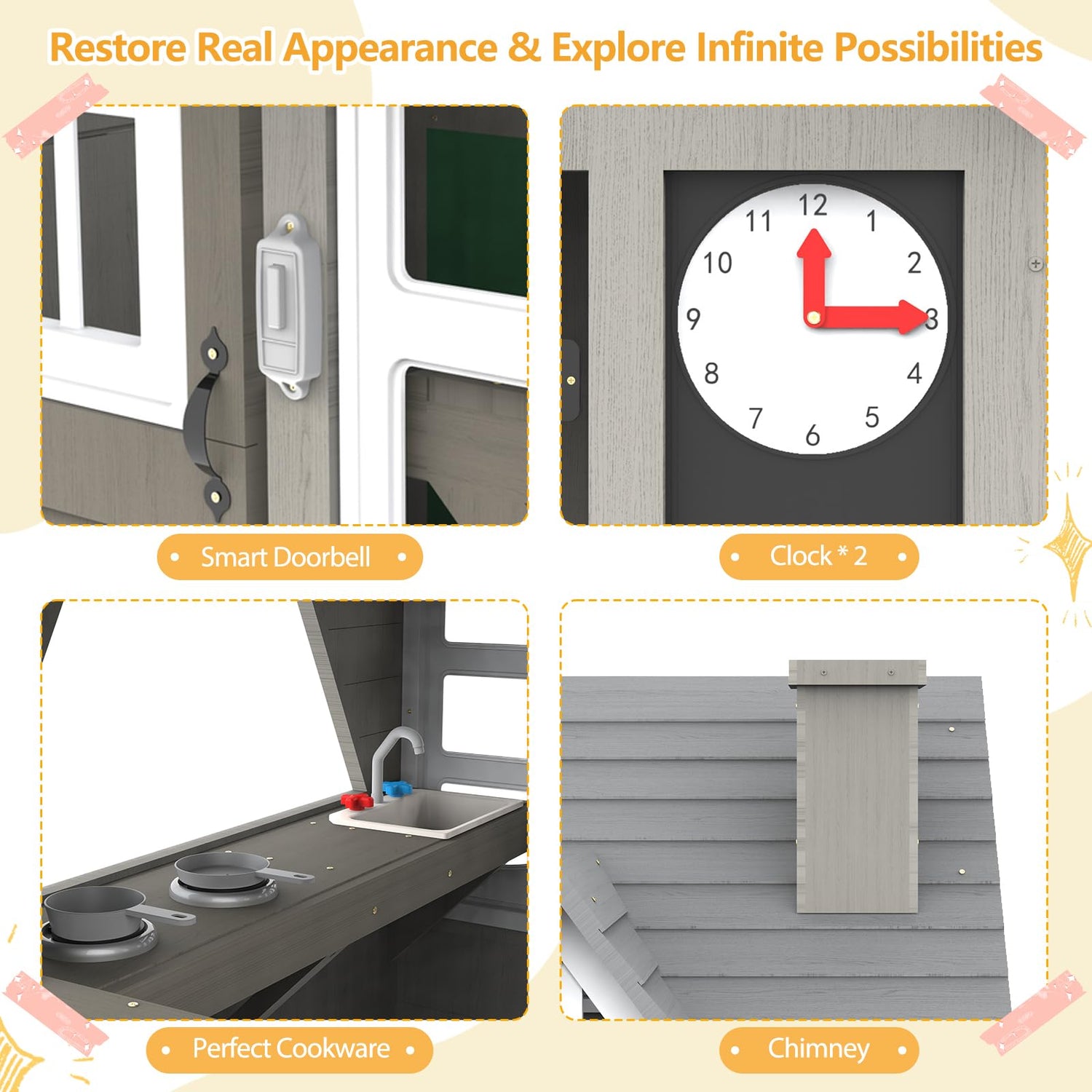 Segmart Kids Playhouse, Indoor and Outdoor Playset, Cedar Modern Gray Wooden Play House for Kids Ages 4-8, Kitchen with Spatulas, Induction Cooker, Flower Pot Rack, Functional Doorbell and Sink