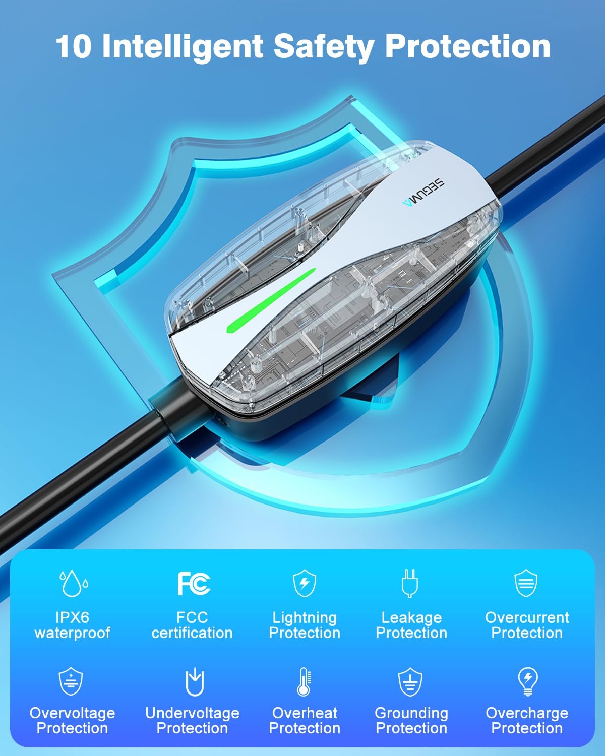 - Intelligent Charging Features---Feature with built-in advanced chipset, Seguma ev charger provides extensive protection against lightning, leakage, grounding issues, over and under voltage, overcharging, excessive current, and overheating. Additionally, the ev level 2 charger automatically shuts off once your vehicle is fully charged, enhancing car safety. Tips: We recommend installing a circuit breaker on your home circuit for added safety measures.