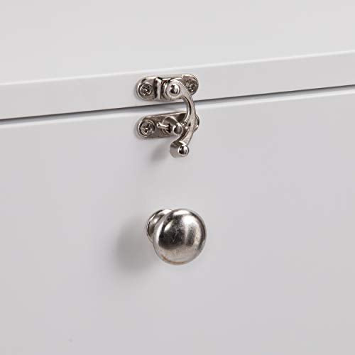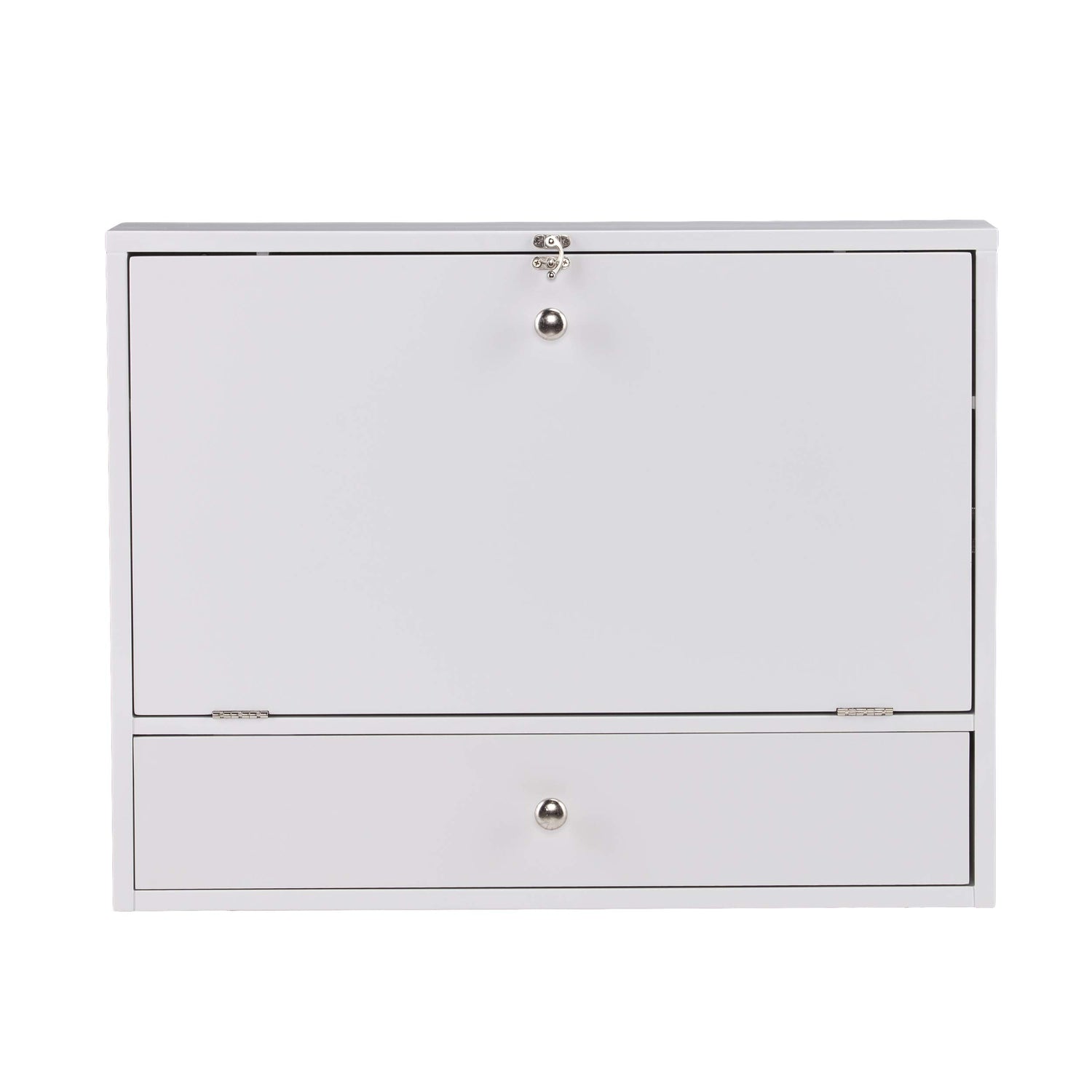 Details: Unlatch a world of storage opportunities with this snappy white, multifunctional floating desk. Fold-down writing surface also works as a stand for a laptop or tablet, snack or drink tray, or imagination station. Multiple sized cubbies store office essentials, recipe cards, or stampers; angled paper organizer and corkboard keep tasks in check. Mount this goes anywhere space saver as a laptop desk in the home office or open concept living space, recipe center in the kitchen or dining room, or organized design place in a craft room.