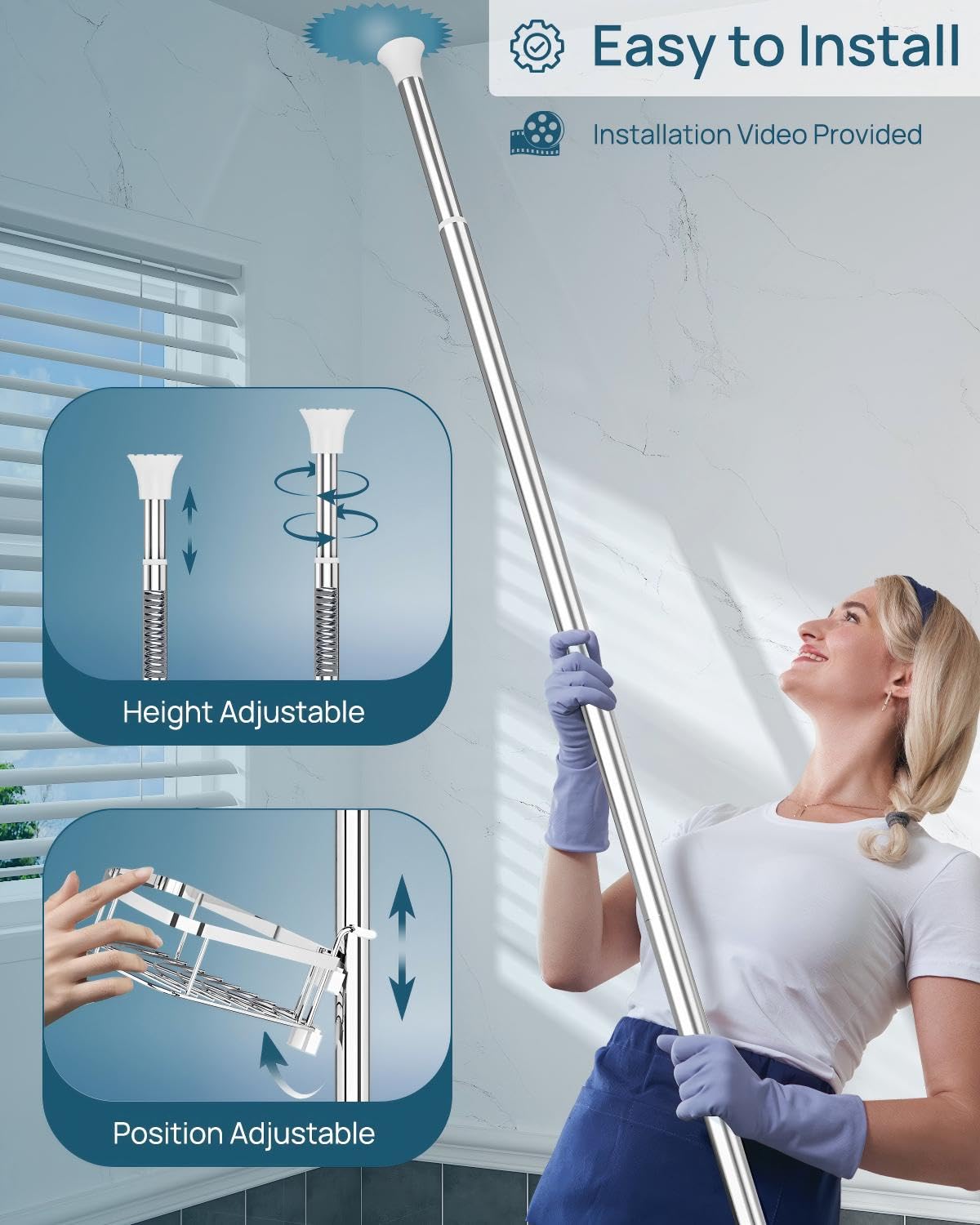 - [Unmatched Ease of Installation]: In contrast to others'shower corner shelf, our shower racks for inside shower is refreshingly simple. By placing the pole in a corner and hanging the baskets on it, our setup not only minimizes initial effort but also facilitates hassle-free height adjustments of the baskets at any time