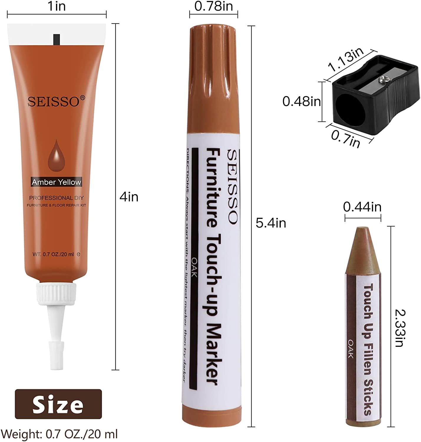 - SEISSO Wood Furniture Repair Kit: Two sets furniture repair products including 12 wood fillers, 8 furniture touch up markers, 8 wax crayons, 12 brushes, 1 crayon sharpener and 1 smoothing spatula.