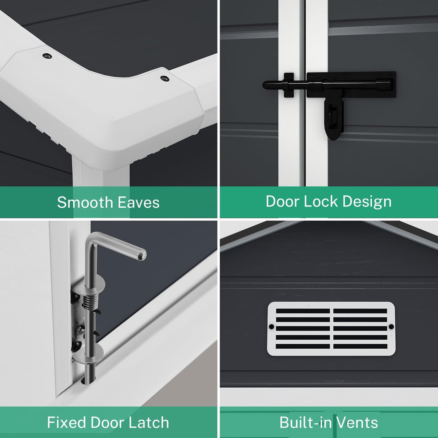 - [User-Friendly Designs Meet Your Needs]: The functional outdoor storage clearance resin shed has lockable doors that provide security for stored items, preventing theft and damage. Light-permeable side window allows natural light to illuminate the interior, reducing the need for artificial lighting. Louvered vents promote airflow, preventing dampness and heat. The sloped roof facilitates drainage and prevents rainwater accumulation, thereby extending the life of shed.