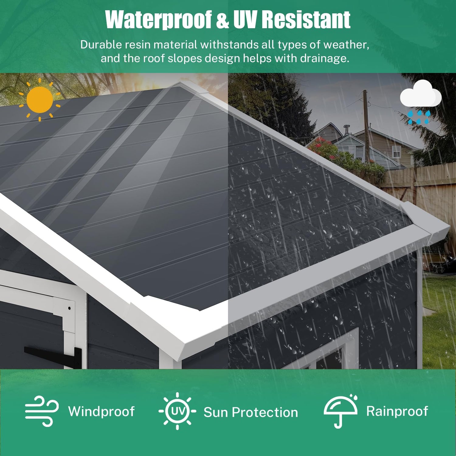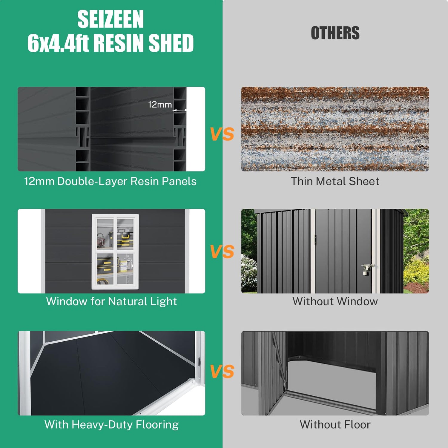 - [Superior Quality Material Resist Weather]: Unlike traditional wooden or metal sheds, Seizeen plastic shed is made from high-grade thermoplastic synthetic resin for durability and sturdiness. The 12mm thick double-layered resin panels are not easily deformed or cracked. Corrosion-resistant, waterproof and UV resistant properties make shed suitable for all weather conditions. Colorfast and eco-friendly material, long service life and low maintenance make it a sustainable outdoor storage solution.