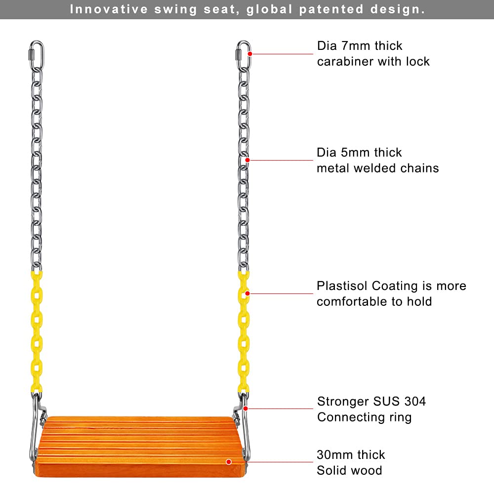 - 【Sturdy】Our wood swing seat is made of 1 inch thick solid wood, safe and durable than others, can support about 500 LB. Hanging tree swing set has 2 x 66” plastisol coating chain, prevent corrosion and rusting, ensure your child has fun while protecting their hands and fingers from getting pinched.