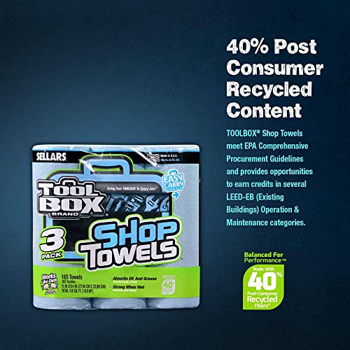Details: Sellers Toolbox shop towel small rolls are just the right size to handle your dirtiest and toughest wiping applications around the shop or home. Toolbox blue shop towels are ideal for general shop, industrial or home garage applications. Blue color helps hide grease and grime better than white shop towels allowing for longer use before being discarded. Toolbox blue shop towels are made with 40 percent post consumer recycled fibers (based only on the product's fiber content, which represents a minimum of 85 percent of the total product weight). Toolbox blue shop towels meet the EPA comprehensive procurement guidelines and also provide opportunities to earn credits in several LEED-EB (existing buildings) operations and maintenance categories. Made in the USA. Measures 11-inches length by 9. 4-inches width.