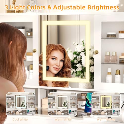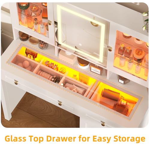 Semoic White Makeup Vanity Desk with LED Mirror and RGB Lights and Power Outlet, Morden Glass Top Vanity Table with Drawer & Storage Cabinet & Adjustable Shelves, Large Dressing Table for Bedroom